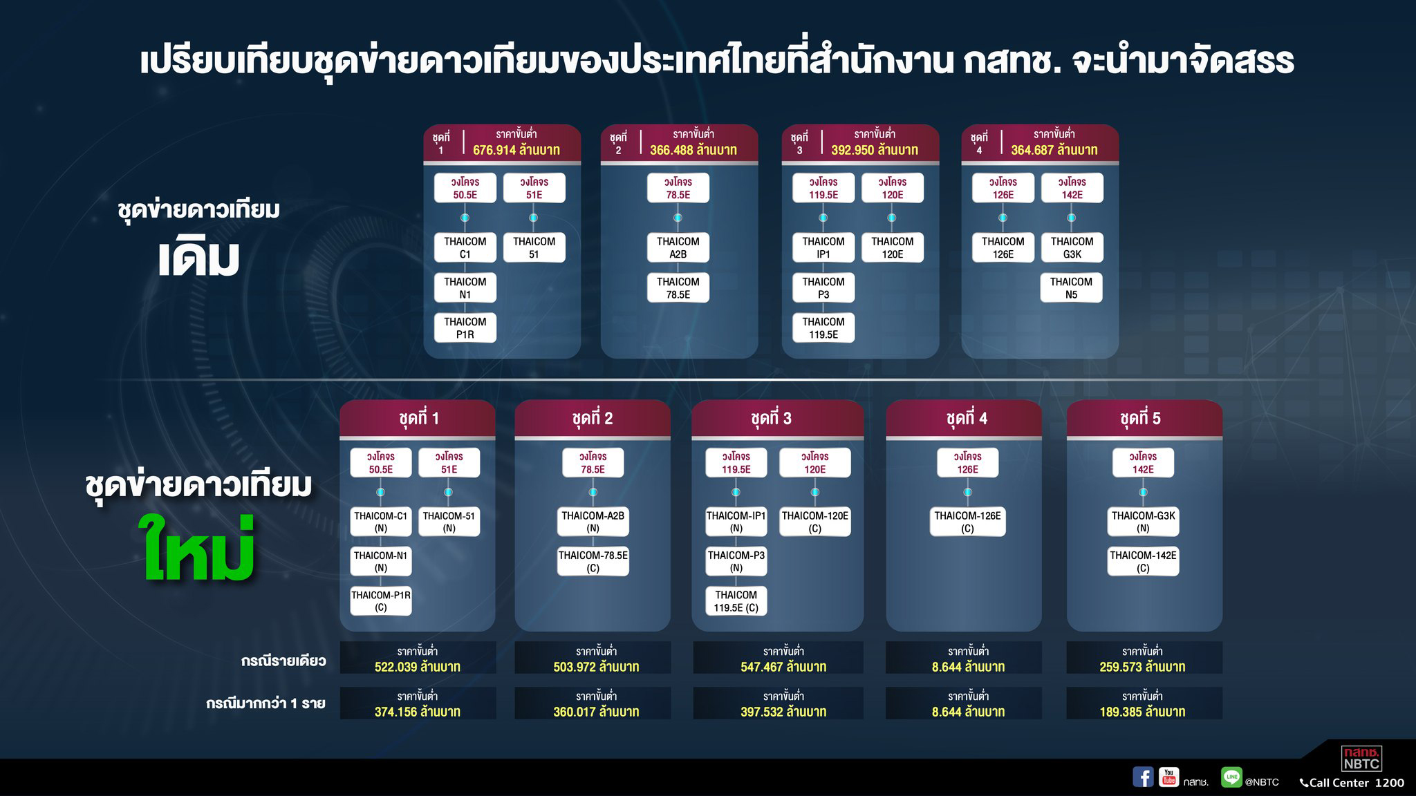 สำหรับชุดข่ายงานดาวเทียมที่จะนำมาประมูลฯ ในครั้งนี้ มีทั้งสิ้น 5 ชุด (Package) ราคาเริ่มต้นประมาณ 1,328 ล้านบาท ประกอบด้วย