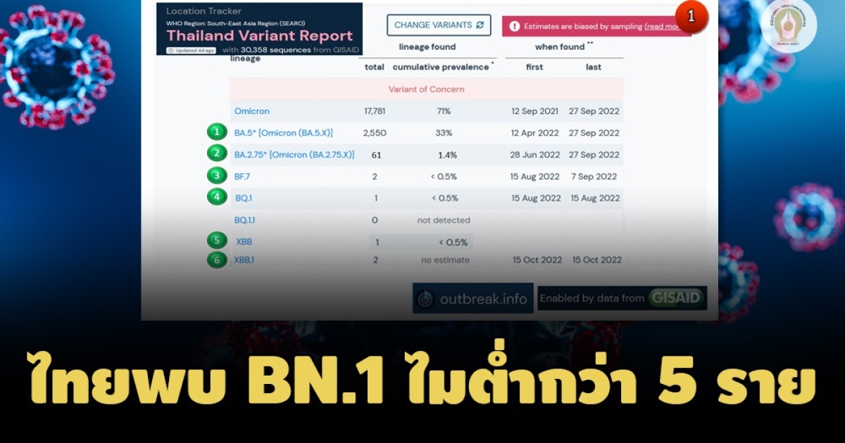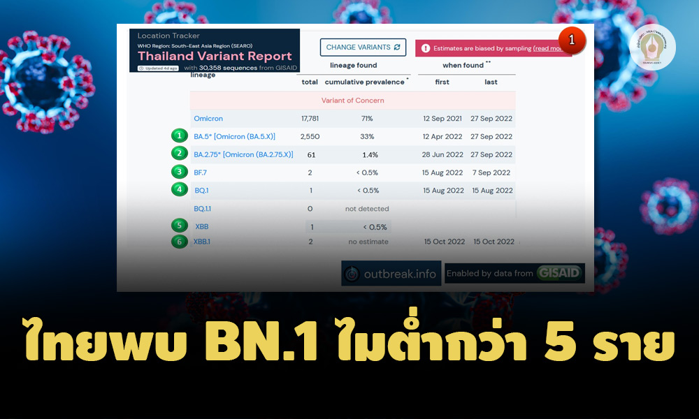จากฐานข้อมูลรหัสพันธุกรรมโควิดโลก 'GISAID' พบ BN.1 ในประเทศไทยจากผู้ติดเชื้อไม่น้อยกว่า 5 ราย ถือเป็นสายพันธุ์ย่อยลำดับที่ 3 ที่ไทยควรเฝ้าติดตาม (อันดับ1 คือ BA.5 ลำดับสองคือ BA.2.75)