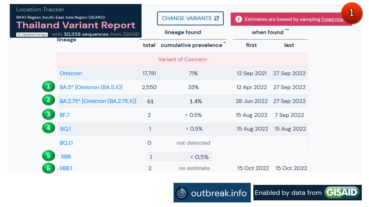 อนึ่งโอไมครอนที่พบจากผู้ติดเชื้อในประเทศไทยมีจำนวนมากว่า 17,781 ราย คิดเป็นร้อยละ 71 (ระหว่าง 12 ก.ย. 2564- 27 ก.ย.2565) โดยยังไม่พบโอไมครอนสายพันธุ์ย่อย BQ.1.1, และ สายพันธุ์ลูกผสม XBC จากฐานข้อมูลโควิดโลก 'กิสเสด' ในขณะนี้ (15/11/2565)