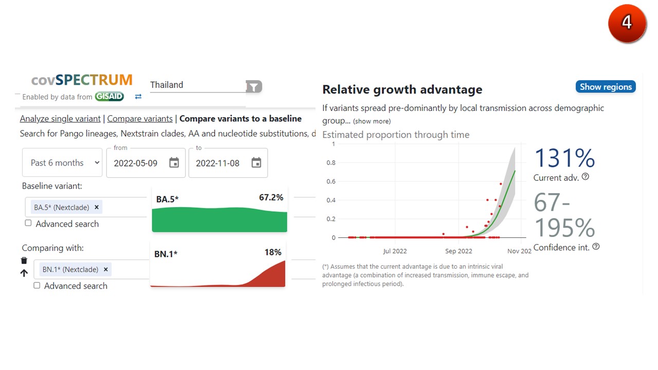 โอไมครอน BN.1* [BN.1.3 (87.50%), BN.1 (6.25%), BN.1.2 (6.25%)] ในประเทศไทยมีความได้เปรียบในการเติบโต-แพร่ระบาด เหนือกว่า BA.5* [BA.5.2 (55.04%), BA.5.2.26 (13.51%), BA.5.2.1 (11.69%), BA.5.2.22 (6.57%), BA.5.1 (3.02%)] ถึง 131%