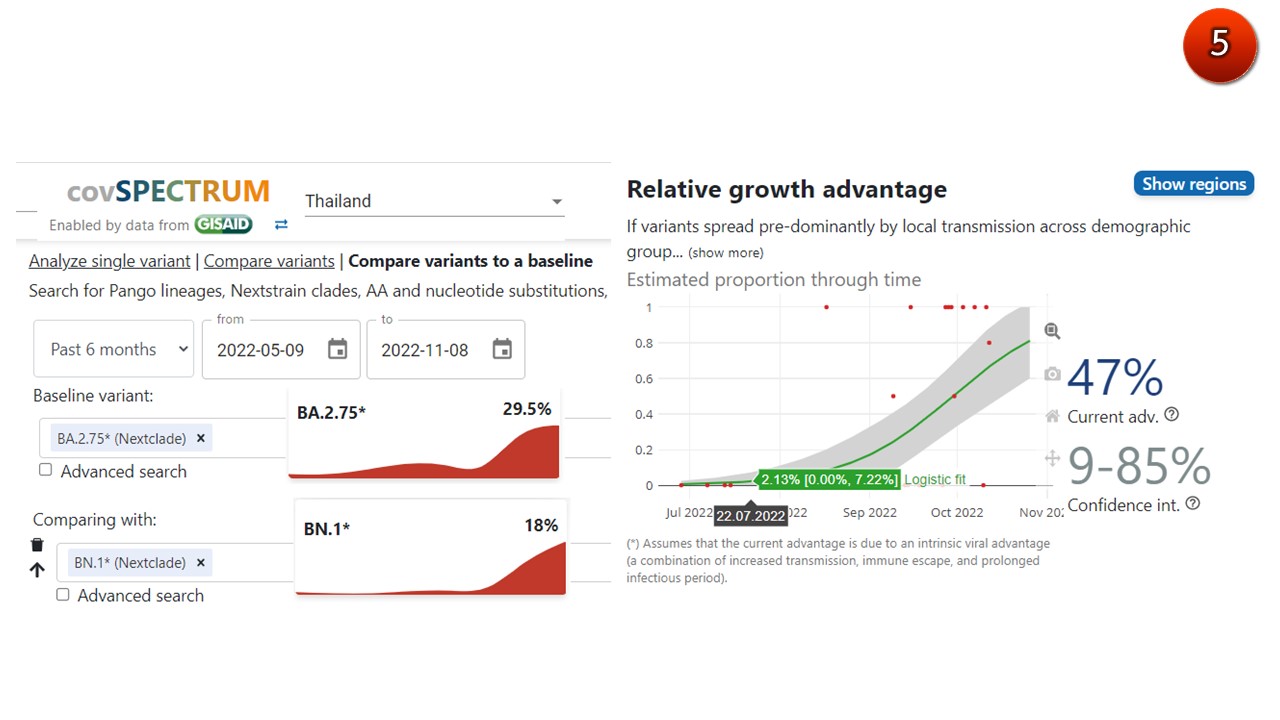 โอไมครอน BN.1* มีความได้เปรียบในการเติบโต-แพร่ระบาด เหนือกว่า BA.2.75* [BA.2.75 (24.49%), BA.2.75.1 (8.16%), BA.2.75.2 (8.16%), etc.] ประมาณ 47%
