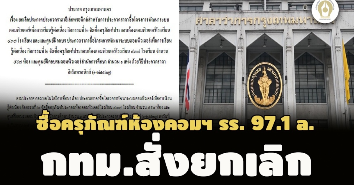 กทม. ประกาศยกเลิก ประกวดราคาซื้อโครงการพัฒนาระบบคอมพิวเตอร์เพื่อการเรียนรู้ต่อเนื่อง กิจกรรมที่ 2 จัดซื้อครุภัณฑ์ประกอบห้องคอมพิวเตอร์โรงเรียน 437 โรงเรียน 598 ห้อง พร้อมศูนย์ฝึกอบรม 1 แห่ง 97.1 ล. ยกเหตุผลมีผู้ยื่นข้อเสนอถูกต้องรายเดียว พบ 1 รายต่ำสุด 95.9 ล.