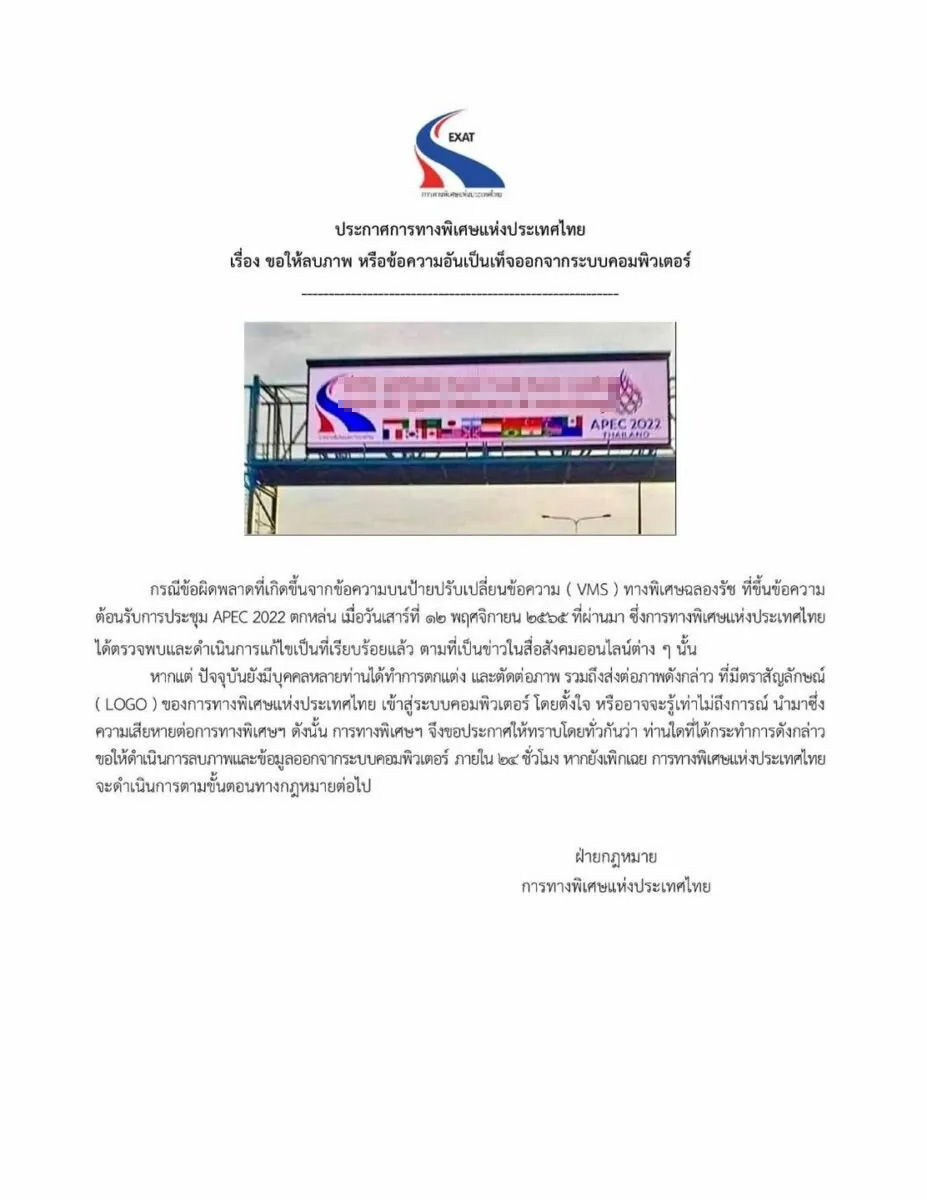 การทางพิเศษแห่งประเทศไทย แจ้งขอให้ลบภาพ ป้ายตัดต่อข้อความอันเป็นเท็จต้อนรับประชุมเอเปก 2022 ภายใน 24 ชม. หากเพิกเฉย จะดำเนินการตามขั้นตอนกฎหมายพ.ร.บ.คอมฯ ผู้ว่า กทพ. แจงลบประกาศออกจริง แต่ยังดำเนินคดีอยู่