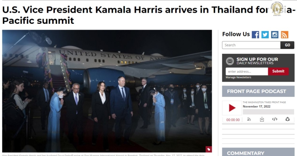 เรียบเรียงจาก:https://www.washingtontimes.com/news/2022/nov/17/us-vice-president-kamala-harris-arrives-in-thailan/,https://abcnews.go.com/US/wireStory/us-vp-harris-arrives-thailand-asia-pacific-summit-93483160
