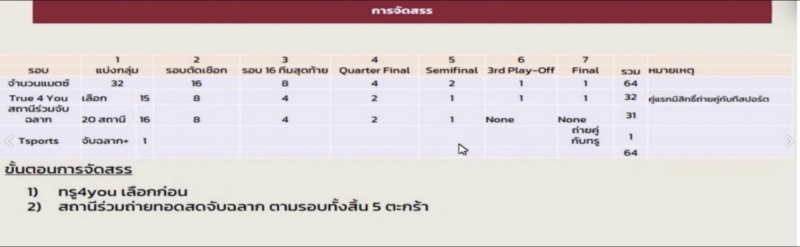 2.กรณีกลุ่มทรูให้การสนับสนุนจำนวน 300 ล้านบาท ได้รับสิทธิประโยชน์ ครอบคลุมสิทธิ์การถ่ายทอด ทุกช่องทาง ทุกแพลตฟอร์ม แบบ exclusive ได้สิทธิ์ในการเลือกคู่แข่งขัน จำนวน 32 แมทช์ และได้นาทีโฆษณา จากช่องทีวีดิจิตอลที่ร่วมถ่ายทอดจาก กกท.