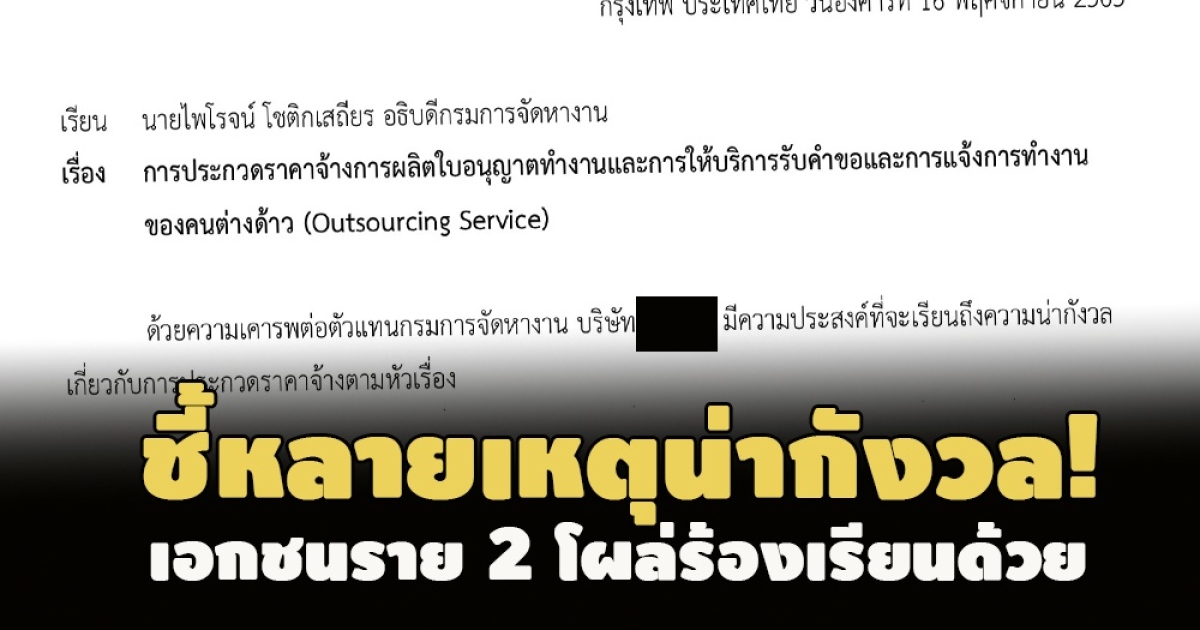 โดยหนังสือร้องเรียนบริษัทเอกชนรายที่ 2 ระบุว่า ด้วยความเคารพต่อตัวแทนกรมการจัดหางาน บริษัทฯ มีความประสงค์ที่จะเรียนถึงความน่ากังวลเกี่ยวกับการประกวดราคาจ้าง
