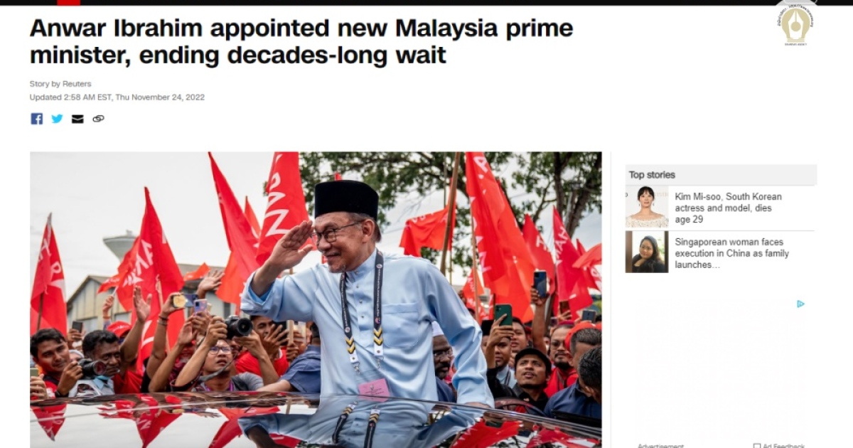 สำนักข่าวอิศรา (www.isranews.org) รายงานข่าวสถานการณ์เกี่ยวกับการเลือกตั้งในประเทศมาเลเซียว่าสำนักข่าวเอเอฟพีรายงานแถลงการณ์จากสำนักพระราชวังมาเลเซีย “หลังจากพิจารณามุมมองจากคณะผู้ปกครองมาเลย์ สมเด็จพระราชธิบดีทรงเห็นชอบแต่งตั้งนายอันวาร์ อิบราฮิม เป็นนายกรัฐมนตรีมาเลเซียคนที่ 10”