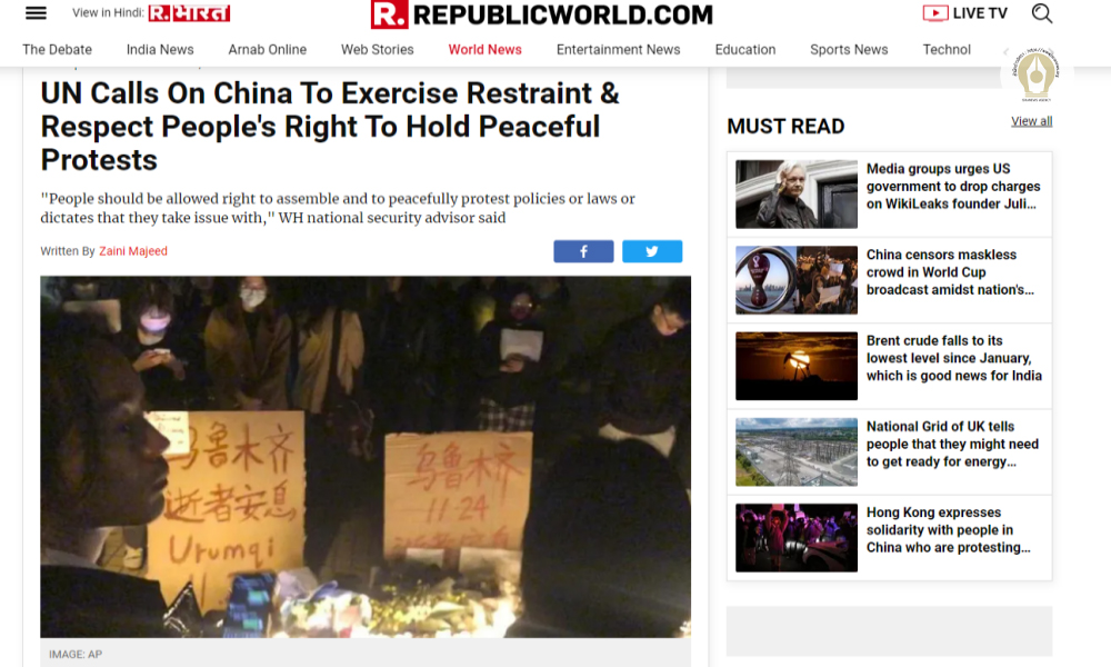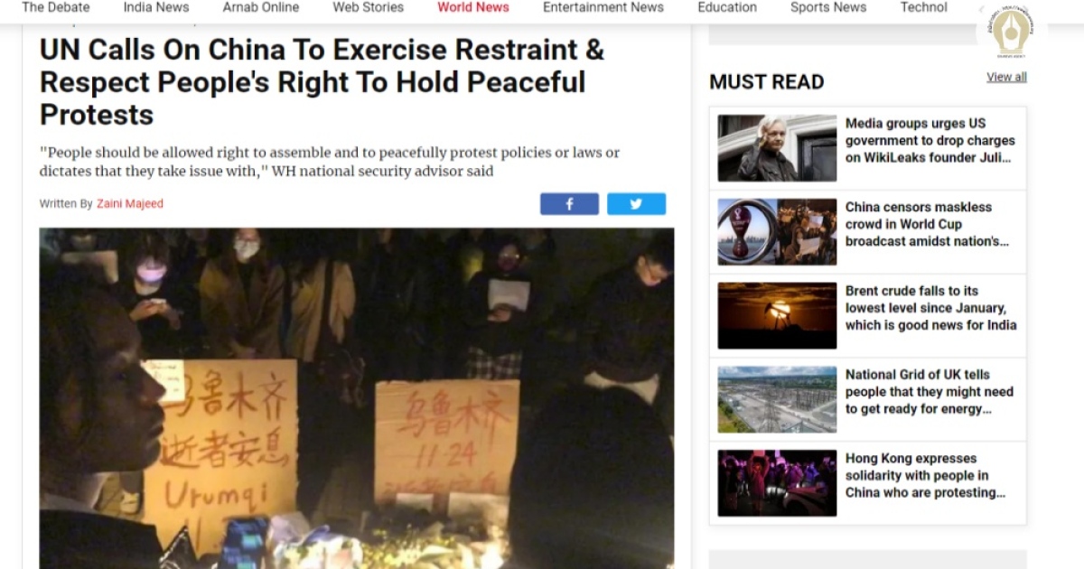 โดยนายเจเรมี ลอเรนซ์ โฆษกสํานักงานสิทธิมนุษยชนแห่งสหประชาชาติกล่าวผ่านแถลงการณ์เมื่อวันที่ 28 พ.ย.ว่าไม่ควรมีใครถูกทุบตีหรือถูกจับกุมเพราะแสดงความคิดเห็นอย่างสันติ หลังจากที่เกิดเหตุเพลิงไหม้อาคารที่พักอาศัยแห่งหนึ่งในภูมิภาคซินเจียงของประเทศจีน นำไปสู่การเสียชีวิตและบาดเจ็บอันน่าเศร้าสลด ซึ่งพื้นที่ส่วนใหญ่ของภูมิภาคนั้นอยู่ภายใต้การล็อกดาวน์อย่างเข้มข้นมาตั้งแต่เดือน ส.ค.ที่ผ่านมาแล้ว ดังนั้นเราจึงเน้นย้ำว่าจะต้องมีการตอบสนองอย่างโปร่งใสต่อข้อกังวลของสาธารณชน และเพื่อจะเรียนรู้บทเรียนจากโศกนาฏกรรมในครั้งนี้