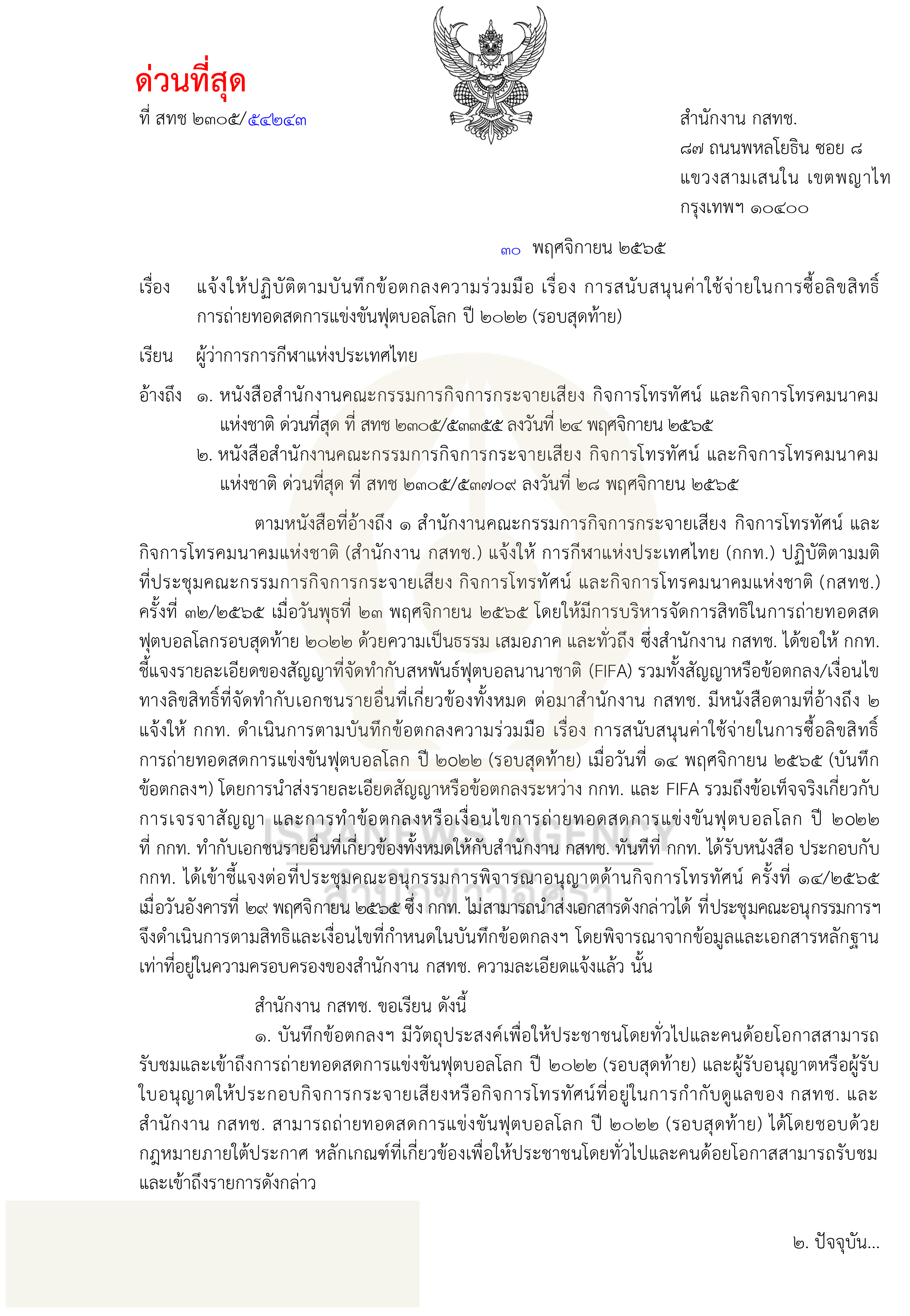 โดยสำนักงาน กสทช. ขอให้ กกท.ปฏิบัติให้ถูกต้องตามเงื่อนไขและวัตถุประสงค์ของบันทึกข้อตกลงฯ ซึ่งกำหนดให้ กกท.ต้องบริหารจัดการสิทธิให้ผู้รับอนุญาตให้ประกอบกิจการกระจายเสียงหรือกิจการโทรทัศน์ที่อยู่ในการกำกับดูแลของ กสทช. และสำนักงาน กสทช. สามารถถ่ายทอดสดการแข่งขันฟุตบอลโลก ปี 2022 (รอบสุดท้าย) ได้ตามประกาศ กสทช. เรื่อง หลักเกณฑ์การเผยแพร่กิจการโทรทัศน์ที่ให้บริการทั่วไป