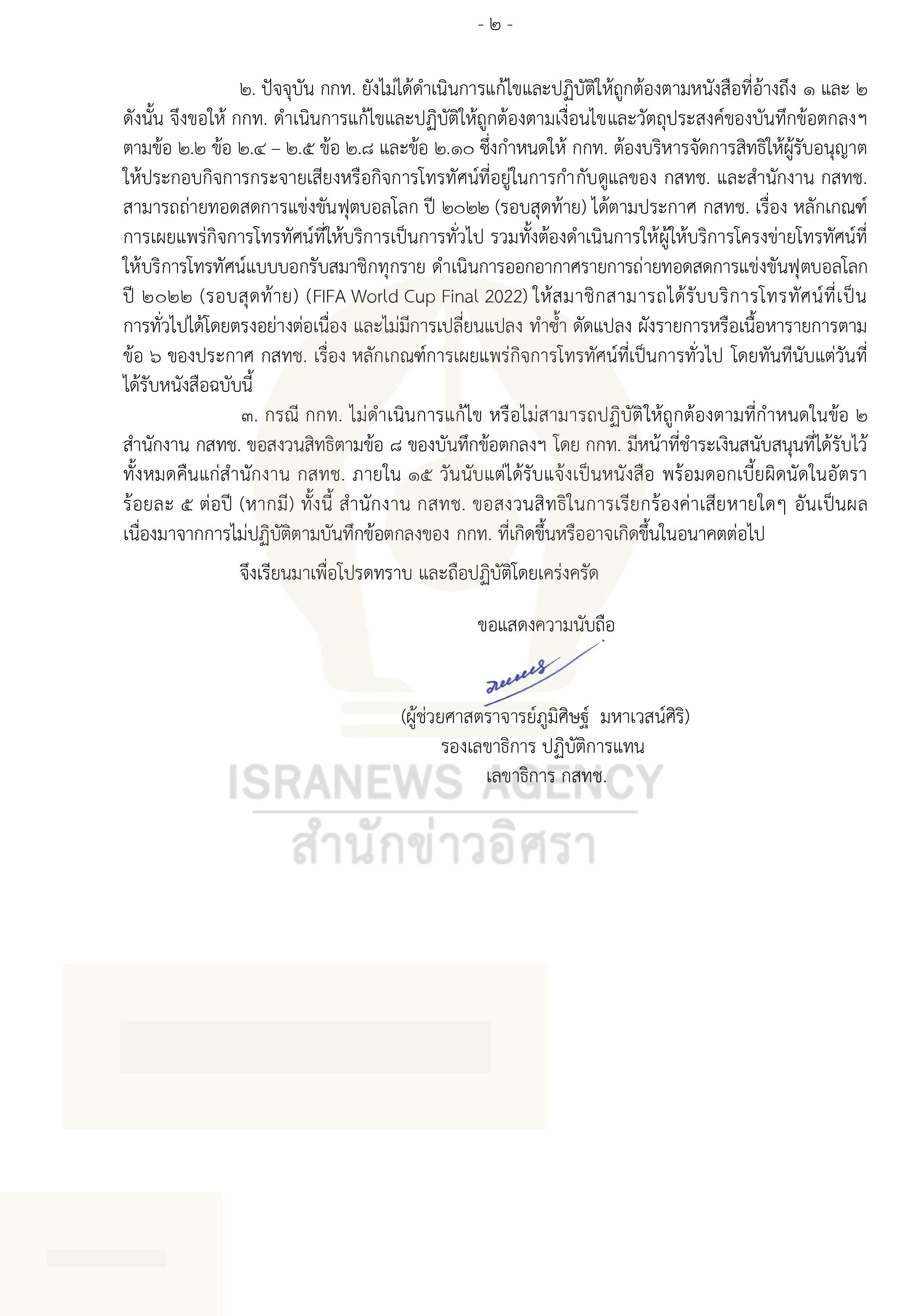 รวมทั้งต้องดำเนินการให้ผู้ให้บริการโครงข่ายโทรทัศน์ที่ให้บริการโทรทัศน์แบบบอกรับสมาชิกทุกราย ดำเนินการออกอากาศรายการถ่ายทอดสดการแข่งขันฟุตบอลโลก ปี 2022 (รอบสุดท้าย) (FIFA World Cup Final 2022) ให้สมาชิกสามารถได้รับบริการโทรทัศน์ที่เป็นการทั่วไปได้โดยตรงอย่างต่อเนื่อง และไม่มีการเปลี่ยนแปลง ทำซ้ำ ดัดแปลง ผังรายการหรือเนื้อหารายการตามข้อ 6 ของประกาศ กสทช. เรื่อง หลักเกณฑ์การเผยแพร่กิจการโทรทัศน์ที่เป็นการทั่วไป โดยทันทีนับแต่วันที่ได้รับหนังสือฉบับนี้
