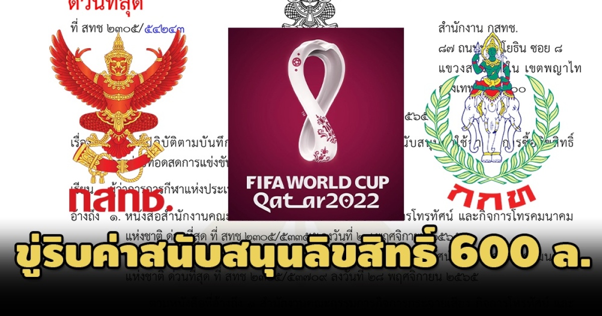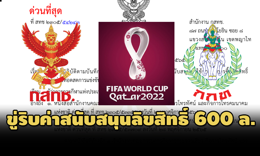 ‘สำนักงาน กสทช.’ ร่อนหนังสือด่วนที่สุดแจ้ง ‘กกท.’ ปฏิบัติตามเงื่อนไข MOU สนับสนุนค่าลิขสิทธิ์ฯ ให้ ‘Pay TV’ ถ่ายทอดสดฟุตบอลโลก 2022 ให้สมาชิกฯรับชมได้ต่อเนื่อง หากไม่ปฏิบัติตามจะถูกริบเงิน 600 ล้านบาทคืน พร้อมคิดดอกเบี้ย 5% ต่อปี