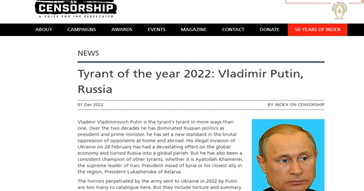 สำนักข่าวอิศรา (www.isranews.org) รายงานข่าวว่าเมื่อวันที่ 1 ธ.ค.ที่ผ่านมา เว็บไซต์องค์กร Index on Censorship ที่มีสำนักงานใหญ่อยู่ที่กรุงลอนดอน โดยเป็นองค์กรส่งเสริมเสรีภาพในการแสดงออกของอังกฤษได้มีการจัดทำรายชื่อหัวข้อ “ทรราชประจำปี 2565”
