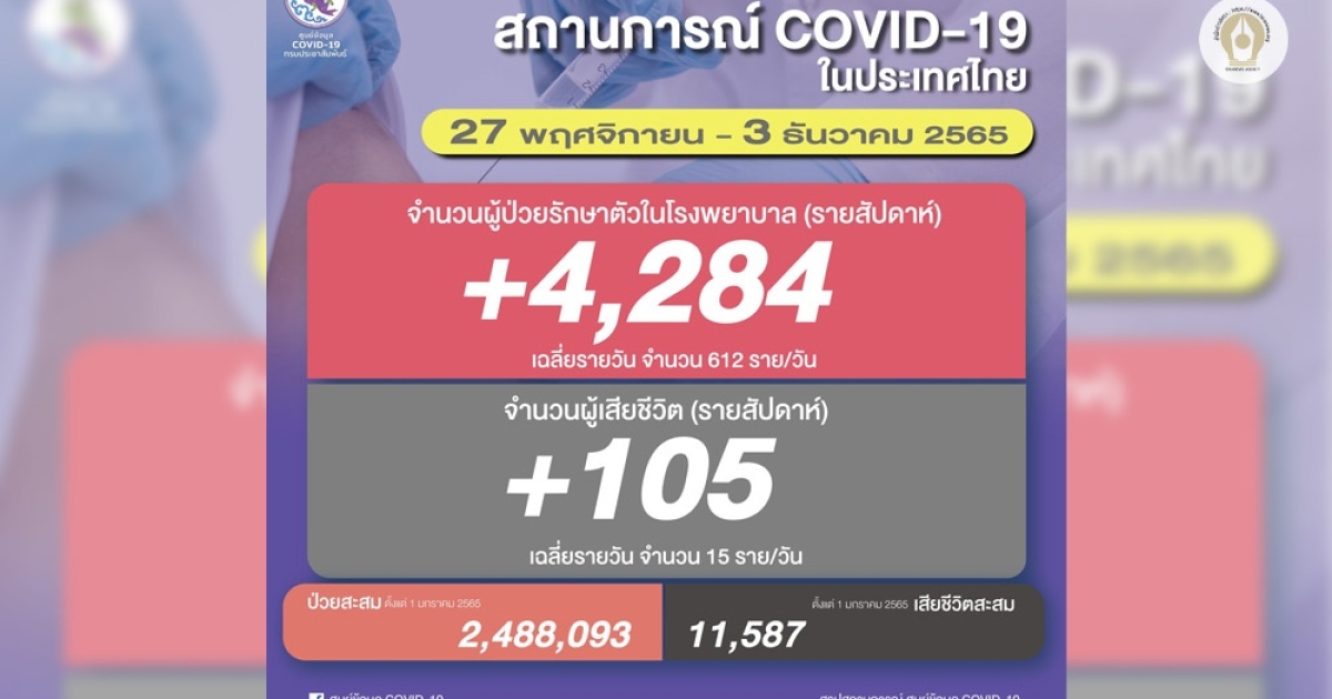 สถานการณ์โควิดไทย สัปดาห์ล่าสุด 27 พ.ย. - 3 ธ.ค. 2565 ติดเชื้อเข้ารักษาใน รพ.ใหม่ 4,284 ราย เฉลี่ย 612/วัน เสียชีวิต 105 ราย เฉลี่ย 15/วัน อาการหนัก 632 ราย