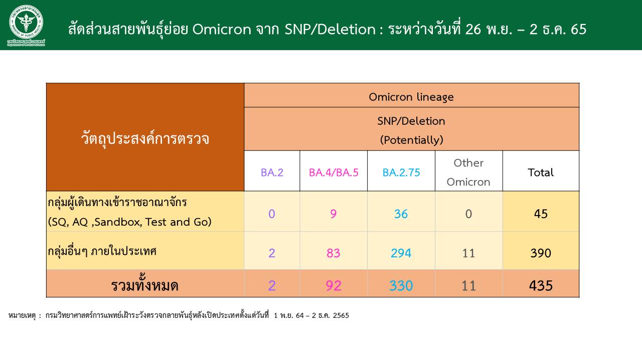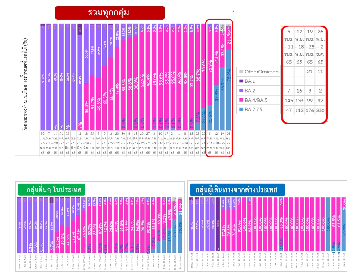 สำนักข่าวอิศรา รายงานว่า เมื่อวันที่ 7 ธ.ค. 2565 นพ.ศุภกิจ ศิริลักษณ์ อธิบดีกรมวิทยาศาสตร์การแพทย์ เปิดเผยว่า ผลการเฝ้าระวังสายพันธุ์เชื้อก่อโรคโควิด 19 ในรอบสัปดาห์ที่ผ่านมาระหว่างวันที่ 26 พ.ย. - 2 ธ.ค. 2565 จากผลการตรวจแบบ SNP/Deletion จำนวน 435 ราย พบว่า ในภาพรวมสัดส่วนของสายพันธุ์ BA.2.75 เพิ่มขึ้นเป็น 75.9% จากสัปดาห์ก่อน ที่มีสัดส่วน 58.9% และเมื่อแยกตามกลุ่ม พบว่า ในกลุ่มผู้ติดเชื้อในประเทศเพิ่มขึ้นจาก 60.1% เป็น 75.4% ทำให้ขณะนี้ สายพันธุ์ BA.2.75 กลายเป็นสายพันธุ์หลักที่ระบาดในประเทศแทนที่สายพันธุ์ BA.5 จากการถอดรหัสพันธุกรรมแบบทั้งตัว (Whole genome sequencing) ของตัวอย่างในประเทศไทยจนถึงปัจจุบัน พบสายพันธุ์ BA.2.75 และลูกหลานของ BA.2.75 เช่น BA.2.75.2, BA.2.75.5.1 (BN.1), BA.2.75.1.2 (BL.2), BA.2.75.3.4.1.1.1.1 (CH.1.1) มากกว่า 856 ราย