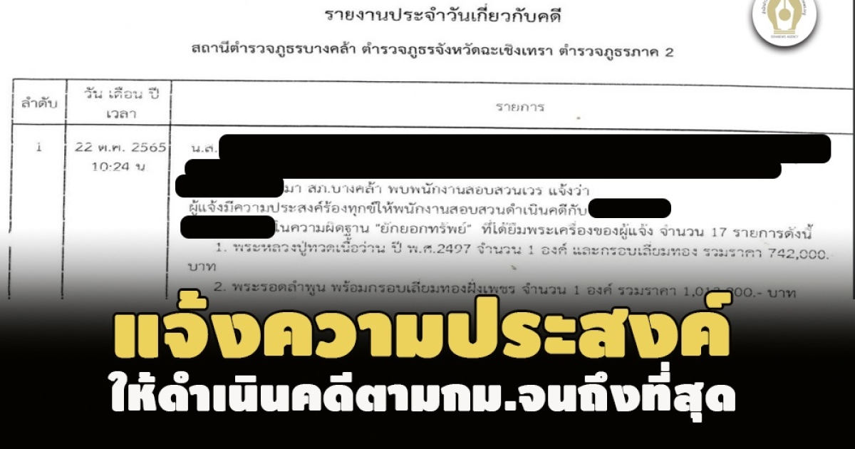 ตร.สภ.บางคล้า ฉะเชิงเทรา ยืนยันอิศรา คนสนิทรองปธ.สภาผู้แทนราษฏร ถูกแจ้งความข้อหา "ยักยอกทรัพย์" ยืมพระ-นาฬิกากว่า 22 ล. ใส่โชว์อวดสังคมไม่ยอมคืนจริง ล่าสุด เจ้าตัวมายื่นหนังสือขอเลื่อนให้ปากคำ 9 ม.ค.2566 แล้ว เผยผู้เสียหายแจ้งความประสงค์ให้ดำเนินคดีตามกฎหมายจนถึงที่สุด