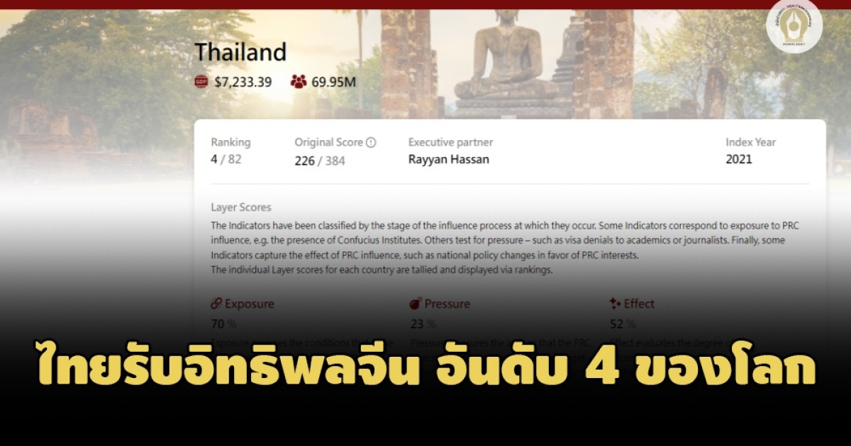 สถาบันไต้หวันจัดอันดับไทยได้รับอิทธิพลจากจีนมากเป็นอันดับที่ 4 ของโลก พบด้านที่มีอิทธิพลมากที่สุดได้แก่ การทหาร คะแนนสูงถึง 80 เปอร์เซ็นต์ ตามมาด้านด้านกฎหมาย 63.6 เปอร์เซ็นต์ ด้านเทคโนโลยี 61.4 เปอร์เซ็นต์