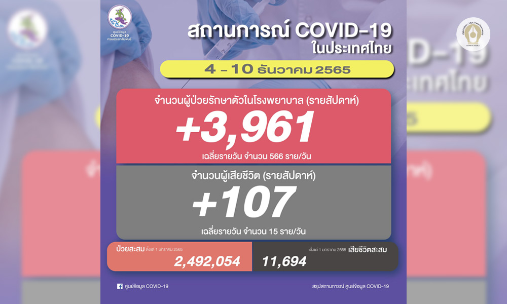 สถานการณ์โควิดไทย สัปดาห์ล่าสุด 4 - 10 ธ.ค. 2565 ติดเชื้อเข้ารักษาใน รพ.ใหม่ 3,961 ราย เฉลี่ย 566/วัน เสียชีวิต 107 ราย เฉลี่ย 15/วัน อาการหนัก 649 ราย