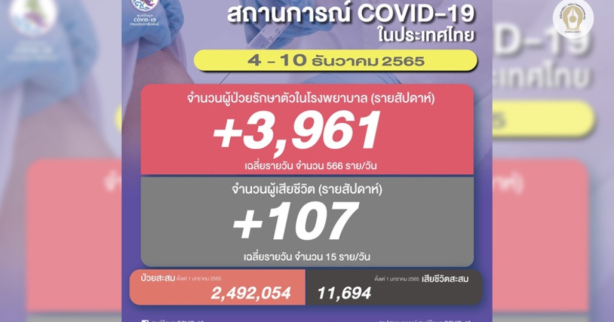 สำนักข่าวอิศรา (www.isranews.org) รายงานสถานการณ์แพร่ระบาดของโรคโควิด-19 ประเทศไทย ประจำสัปดาห์ ระหว่างวันที่ 4 - 10 ธ.ค.2565 มีจำนวนผู้ติดเชื้อใหม่เข้ารักษาตัวโรงพยาบาล 3,961 ราย เฉลี่ยวันละ 566 ราย ทำให้จำนวนผู้ติดเชื้อสะสมอยู่ที่ 2,492,054 ราย (ตั้งแต่ 1 ม.ค. 2565)