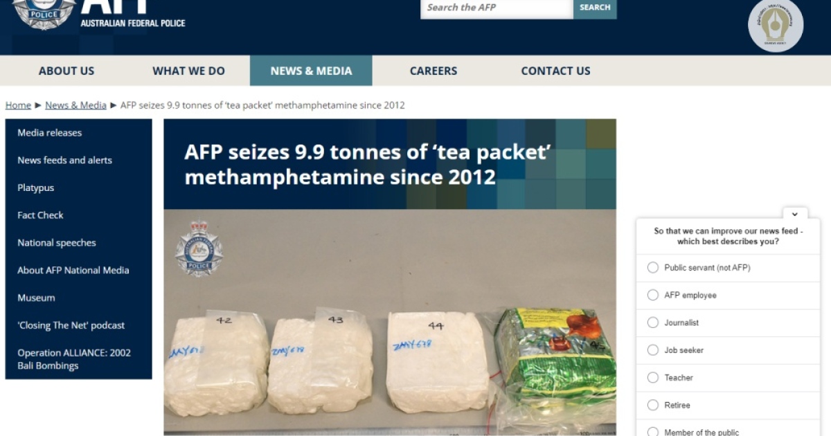 สำหรับในปี 2565 ทางเอเอฟพีได้ขัดขวางไม่ให้มีการนำเข้าเมทแอมเฟตามีนที่มาในรูปแบบของบรรจุภัณฑ์ชา เข้าไปสู่ประเทศออสเตรเลียคิดเป็นปริมาณรวมกว่า 2.1 ตัน ซึ่งจะมีมูลค่าในออสเตรเลียอยู่ที่มากกว่า 1 พันล้านดอลลาร์ฯ