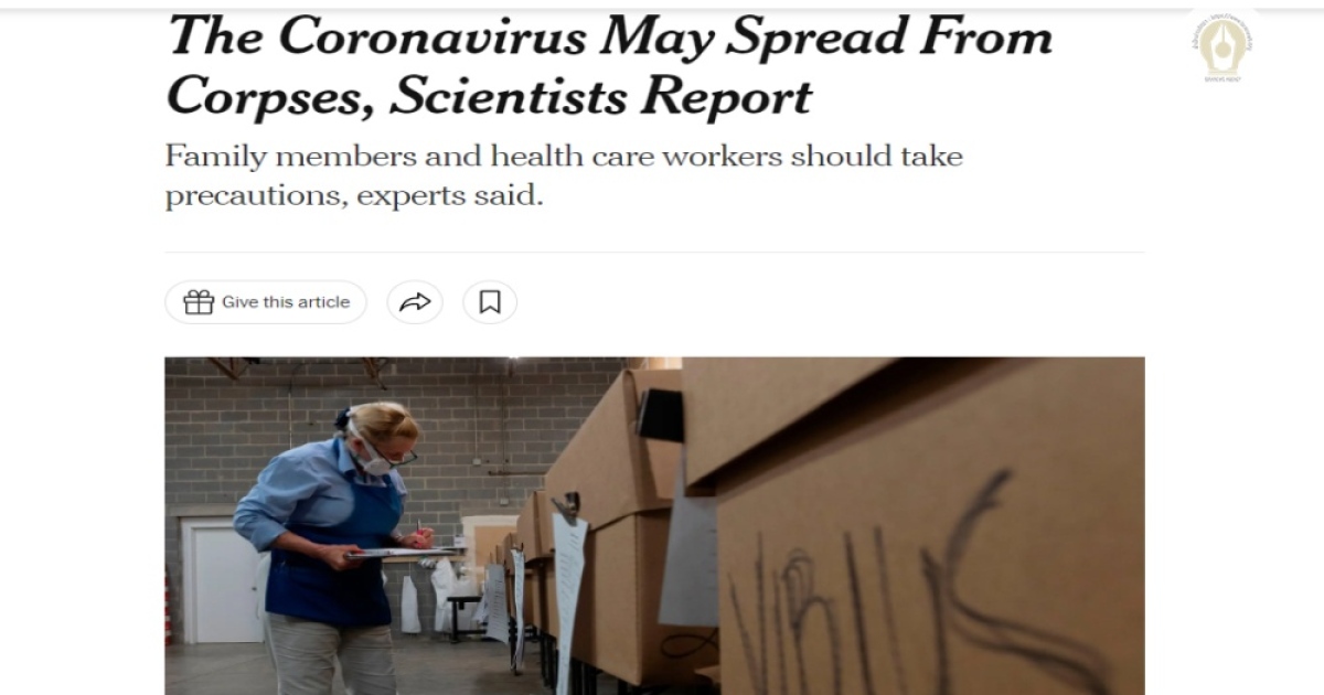 สำนักข่าวอิศรา (www.isranews.org) รายงานสถานการณ์เกี่ยวกับโควิด-19 ว่าสำนักข่าวนิวยอร์กไทมส์ของสหรัฐอเมริกาได้รายงานข่าวผลการวิจัยล่าสุดจำนวนสองชิ้นด้วยกันระบุว่าโควิดนั้นสามารถอยู่ในซากศพของผู้ติดเชื้อได้นานหลังจากการเสียชีวิต