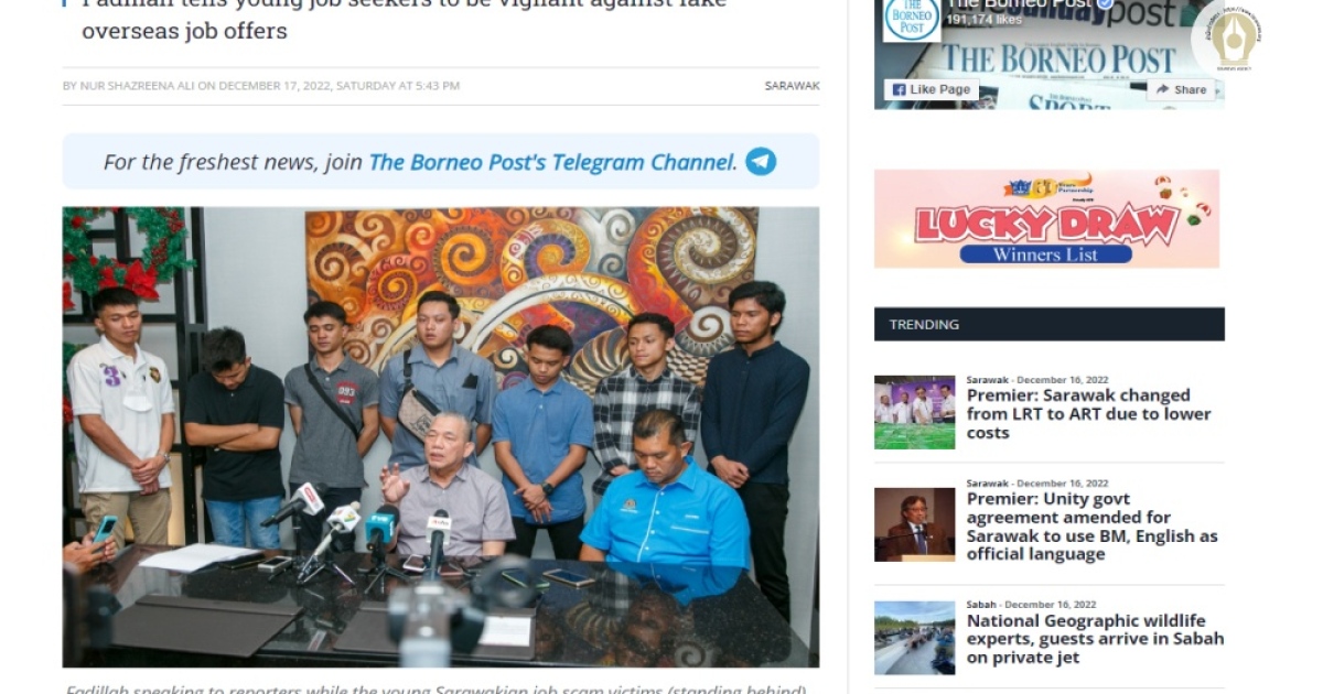 โดยนายฟาดิลลาห์ซึ่งเป็นส.ส.เมืองเปตราจายา รัฐซาราวักด้วยนั้นกล่าวเตือนชาวมาเลเซียและชาวซาราวักว่าให้ระวังข้อเสนองานที่ดูหรูหราในการทำงานในต่างประเทศ ซึ่งเขากังวลว่าจะระวังว่าผู้ที่หางานทำอาจจะตกเป็นเหยื่อได้โดยง่าย