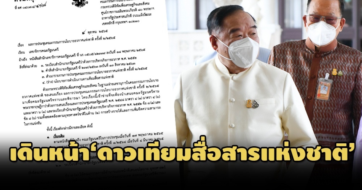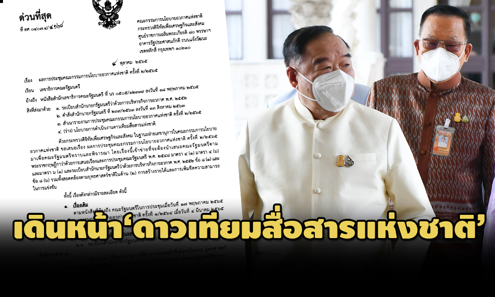 ‘ครม.’ มอบหมาย ‘คณะกรรมการนโยบายอวกาศแห่งชาติ’ เสนอแนะแนวทางดำเนินงาน ‘ดาวเทียมสื่อสารแห่งชาติ’ ที่เหมาะสม ก่อนชง ครม. เคาะอีกครั้ง ขณะที่ ‘พล.อ.ประวิตร’ สั่ง ‘ประธานบอร์ด NT’ เจรจา ‘กสทช.’ ขอสิทธิเข้าใช้วงโคจรดาวเทียม