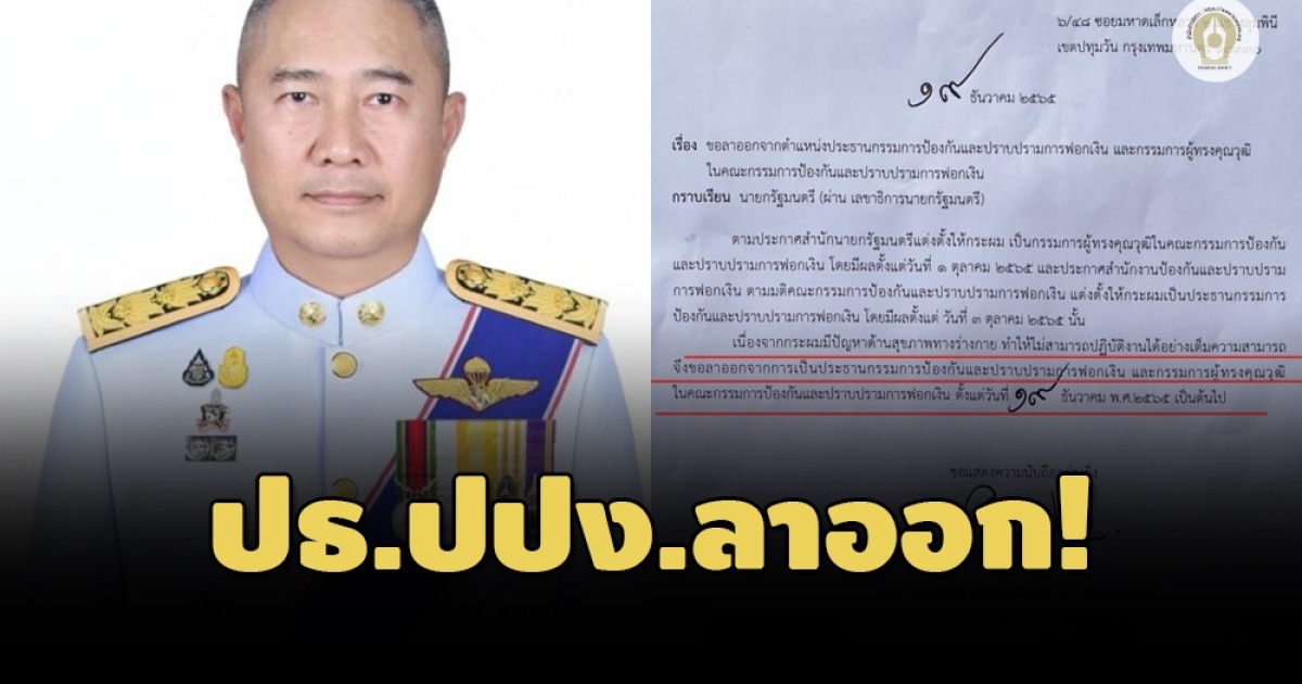 พล.ต.ต.ปิยะพันธ์ ปิงเมือง ปธ. ปปง.ลาออกอ้างปัญหาสุขภาพ หลังถูกพาดพิงเอี่ยวทุนจีนสีเทา เพจชูวิทย์ชมเจ้าตัวตัดสินใจกล้าหาญ เป็นลูกผู้ชาย