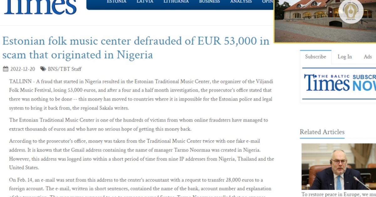 ศูนย์ดนตรีพื้นบ้านเอสโตเนีย ถูกอีเมลปลอมอ้างชื่อผู้จัดการหลอกโอนเงิน 1.9 ล. พบข้อมูลอีเมลปลอมสร้างที่ไนจีเรีย แต่มีล็อกอินจากที่ไทยและสหรัฐฯด้วย ขณะอัยการเอสโตเนียรับหมดหวังตามเงินคืน