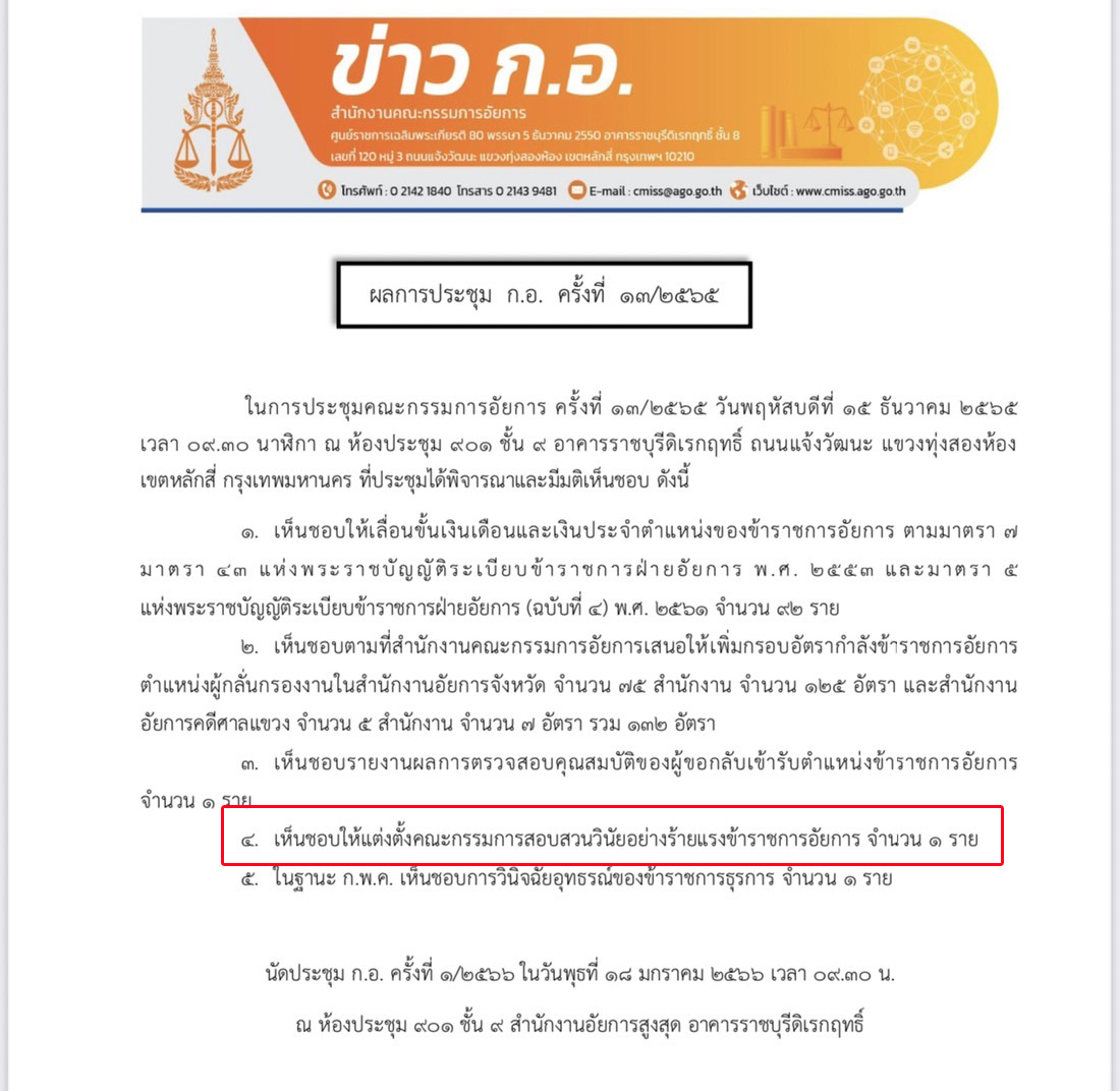 สำนักข่าวอิศรา (www.isranews.org) รายงานว่า เมื่อวันที่15 ธ.ค.2565 ที่ประชุมคณะกรรมการอัยการ (ก.อ.) ได้มีมติเห็นชอบให้แต่งตั้งคณะกรรมการสอบสวนวินัยอย่างร้ายแรง ข้าราชการ อัยการ 1 ราย แต่ไม่ได้มีการเปิดเผยรายละเอียดว่า อัยการรายนี้เป็นใคร และกระทำความผิดวินัยในเรื่องใด (ดูเอกสารประกอบท้ายข่าว)