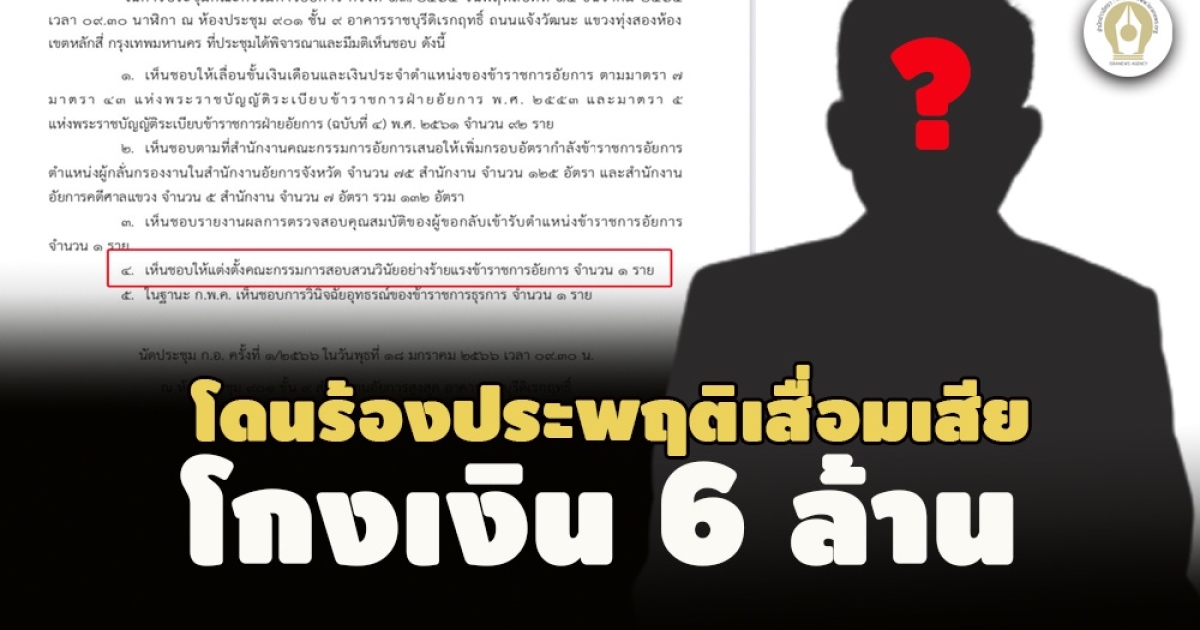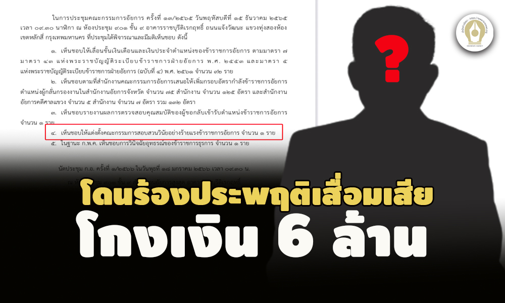 เจาะข้อมูลลับ ก.อ. ตั้งกรรมการสอบวินัยร้ายแรงอัยการอาวุโสปริศนา ฐานประพฤติเสื่อมเสีย เหตุถูกร้องเรียนจากภริยาอดีตขรก.ประจำสำนักพระราชวังไม่ยอมคืนเงินจำนวน 6 ล้านให้ หลังจากนำเงิน 11 ล้าน ไปฝากไว้ช่วงถูกสอบข้อมูลเส้นทางการเงินคดีทุจริต โดยเลี่ยงใช้วิธีทำสัญญาซื้อขายที่ดิน ต่อมาคดียุติเคลียร์ปัญหาเสร็จไปขอคืน กลับให้มาแค่ 5 ล้าน