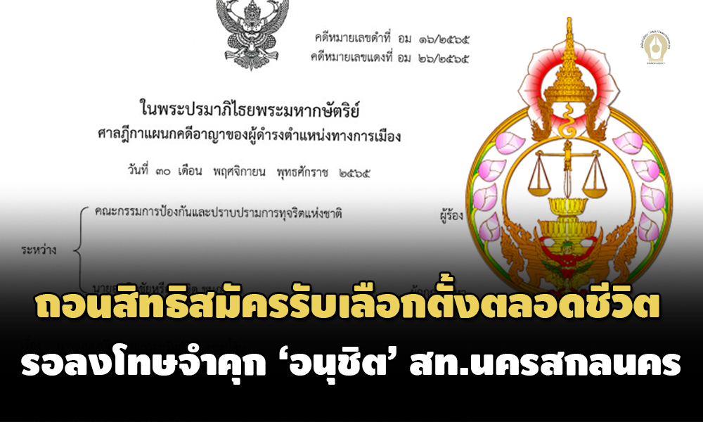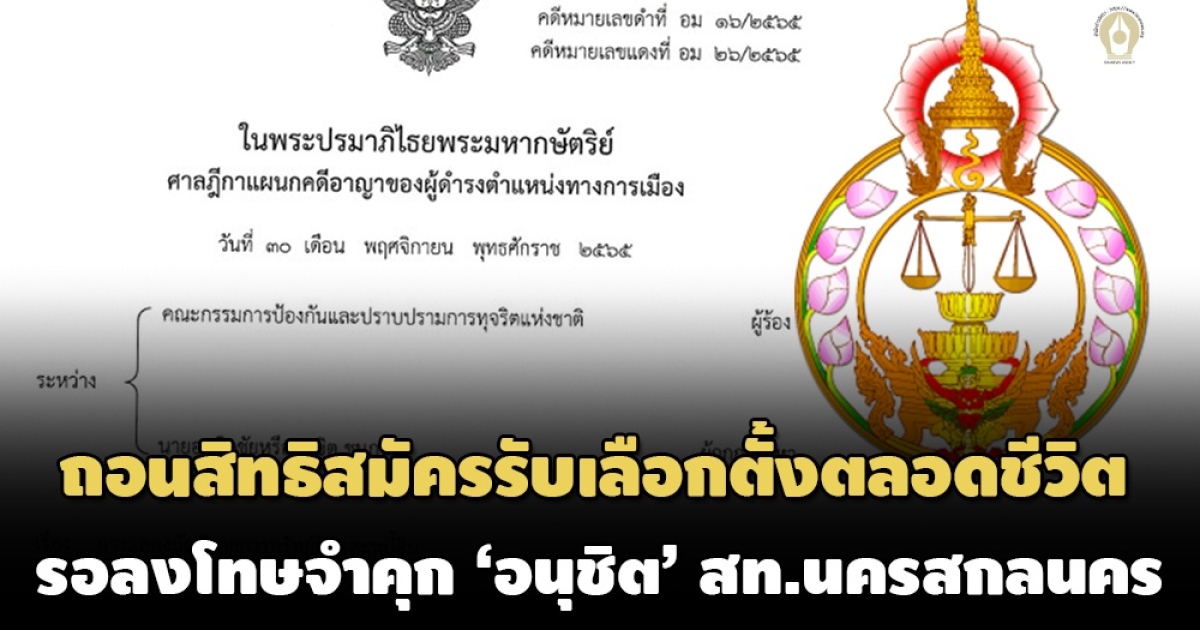 โดนอีกรายท้ายปี 2565 ! ศาลฎีกาฯ สั่งเพิกถอนสิทธิสมัครรับเลือกตั้งตลอดชีวิต ‘อนุชิตชัย-อนุชิต ชมภูราช’ สมาชิกสภาเทศบาลนครสกลนคร จงใจไม่ยื่นเอกสาร พิสูจน์ความมีอยู่จริงของทรัพย์สิน ปปช. 11 รายการ เงินฝาก แบงก์ หนี้ ธกส. สําเนา ภ.ง.ด. จําคุก 1 เดือน ปรับ 4,000 บาท โทษจำคุกรอลงโทษ 1 ปี