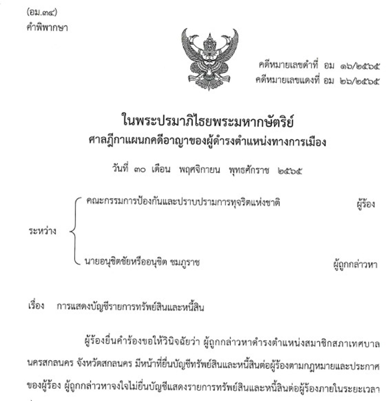 พิพากษาว่า นายอนุชิตชัยหรืออนุชิต ชมภูราช ผู้ถูกกล่าวหา จงใจไม่ยื่นบัญชีแสดงรายการทรัพย์สินและหนี้สินและเอกสารประกอบต่อผู้ร้องและมีพฤติการณ์อันควรเชื่อได้ว่ามีเจตนาไม่แสดงที่มาแห่งทรัพย์สินหรือหนี้สิน กรณีพ้นจากตําแหน่งสมาชิกสภาเทศบาลนครสกลนคร จังหวัดสกลนคร ตามพระราชบัญญัติประกอบรัฐธรรมนูญว่าด้วยการป้องกันและปราบปรามการทุจริต พ.ศ. 2561 มาตรา 114 วรรคสอง (1) ให้เพิกถอนสิทธิสมัครรับเลือกตั้งของผู้ถูกกล่าวหาตลอดไป ตามพระราชบัญญัติประกอบรัฐธรรมนูญว่าด้วยการป้องกันและปราบปรามการทุจริต พ.ศ. 2561 มาตรา 81 กับมีความผิดตามพระราชบัญญัติประกอบรัฐธรรมนูญว่าด้วยการป้องกันและปราบปรามการทุจริต พ.ศ. 2561 มาตรา 167 จําคุก 2 เดือน และปรับ 8,000 บาท ผู้ถูกกล่าวหาให้การรับสารภาพ เป็นประโยชน์แก่การพิจารณา มีเหตุบรรเทาโทษ ลดโทษให้กึ่งหนึ่งตามประมวลกฎหมาย อาญา มาตรา 78 คงจําคุก 1 เดือน และปรับ 4,000 บาท ไม่ปรากฏว่าผู้ถูกกล่าวหาเคยได้รับโทษ จําคุกมาก่อน โทษจําคุกจึงให้รอการลงโทษไว้มีกําหนด 1 ปี ตามประมวลกฎหมายอาญา มาตรา 56 ไม่ชําระค่าปรับให้จัดการตามประมวลกฎหมายอาญา มาตรา 29, 30. (คดีหมายเลขแดงที่ อม. 26/2565 วันที่ 30 พ.ย.2565)