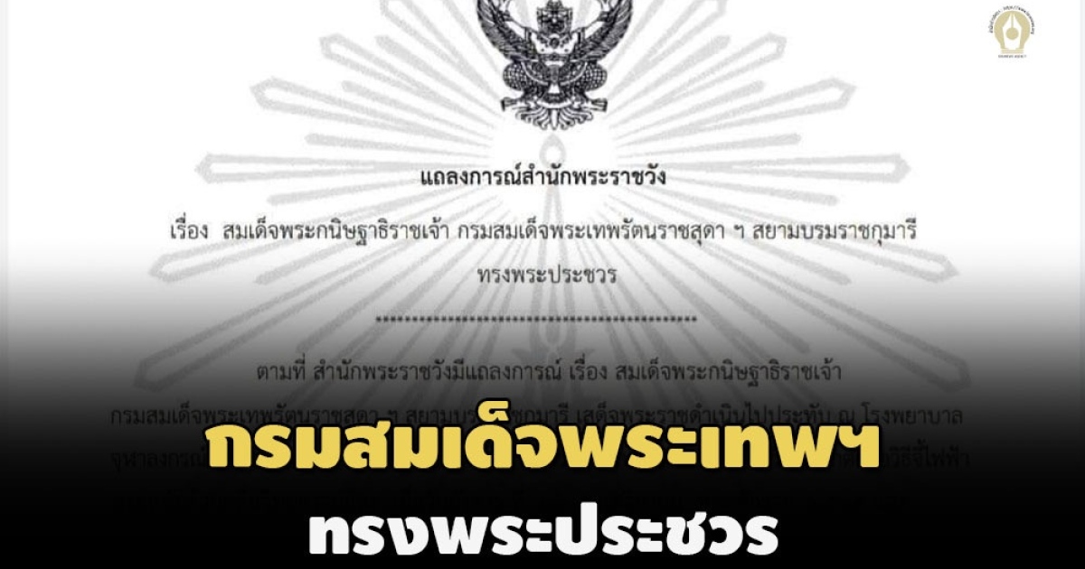สำนักข่าวอิศรา (www.isranews.org) รายงานว่า เมื่อวันที่ 26 ธันวาคม 2565 สำนักพระราชวังได้ออกแถลงการณ์เรื่อง สมเด็จพระกนิษฐาธิราชเจ้า กรมสมเด็จพระเทพรัตนราชสุดาฯ สยามบรมราชกุมารี ทรงพระประชวร