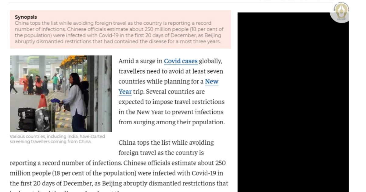 โดยประเทศแรกที่ถูกเตือนได้แก่ประเทศจีนเป็นอันดับหนึ่งที่ควรต้องหลีกเลี่ยงจากการเดินทางไปเยือน เพราะประเทศจีนเพิ่งจะมีรายงานจำนวนผู้ติดเชื้อสูงสุด ซึ่งทางการจีนมีการประเมินว่ามีผู้ติดเชื้อโควิดในประเทศจีนไปแล้ว 250 ล้านคนหรือคิดเป็น 18 เปอร์เซ็นต์ของประชากรทั้งหมด โดยติดเชื้อในรอบ 20 วันแรกของเดือน ธ.ค. ในขณะที่รัฐบาลกรุงปักกิ่งได้ยกเลิกมาตรการการจำกัดโรคที่ดำเนินมาเกือบ 3 ปีอย่างกะทันหัน