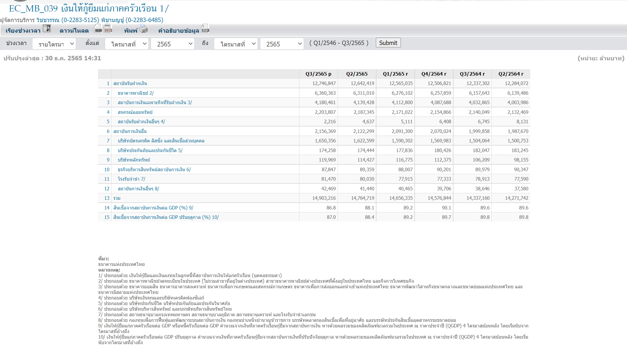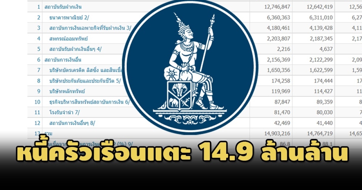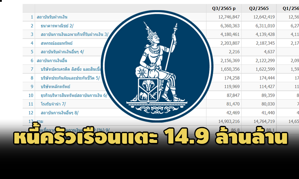 สำนักข่าวอิศรา (www.isranews.org) รายงานว่า เมื่อวันที่ 30 ธ.ค. ธนาคารแห่งประเทศไทย (ธปท.) เผยแพร่สถิติเงินให้กู้ยืมแก่ครัวเรือนหรือหนี้สินครัวเรือน ณ สิ้นไตรมาส 3/2565 พบว่า หนี้สินครัวเรือนไทยมีจำนวน 14.90 ล้านล้านบาท หรือคิดเป็น 86.8% ต่อจีดีพี เทียบกับไตรมาส 2/2565 ที่หนี้สินครัวเรือนไทยมีจำนวน 14.76 ล้านล้านบาท หรือคิดเป็น 88.1% ต่อจีดีพี หรือมีจำนวนหนี้เพิ่มขึ้น 1.38 แสนล้านบาท หรือเพิ่มขึ้นคิดเป็น 0.93% เมื่อเทียบกับไตรมาสก่อน