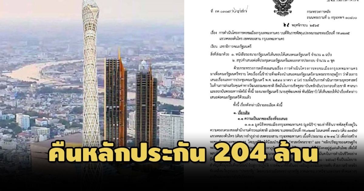 ครม.รับทราบยกเลิกโครงการ ‘หอชมเมืองกรุงเทพฯ’ มูลค่าลงทุน 4.6 พันล้าน พร้อมคืนหลักประกันฯ 204 ล้าน ให้ ‘มูลนิธิหอชมเมืองฯ’ เหตุไม่ได้ทำผิดเงื่อนไขสัญญา