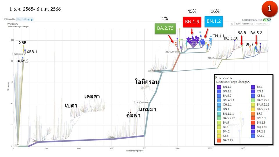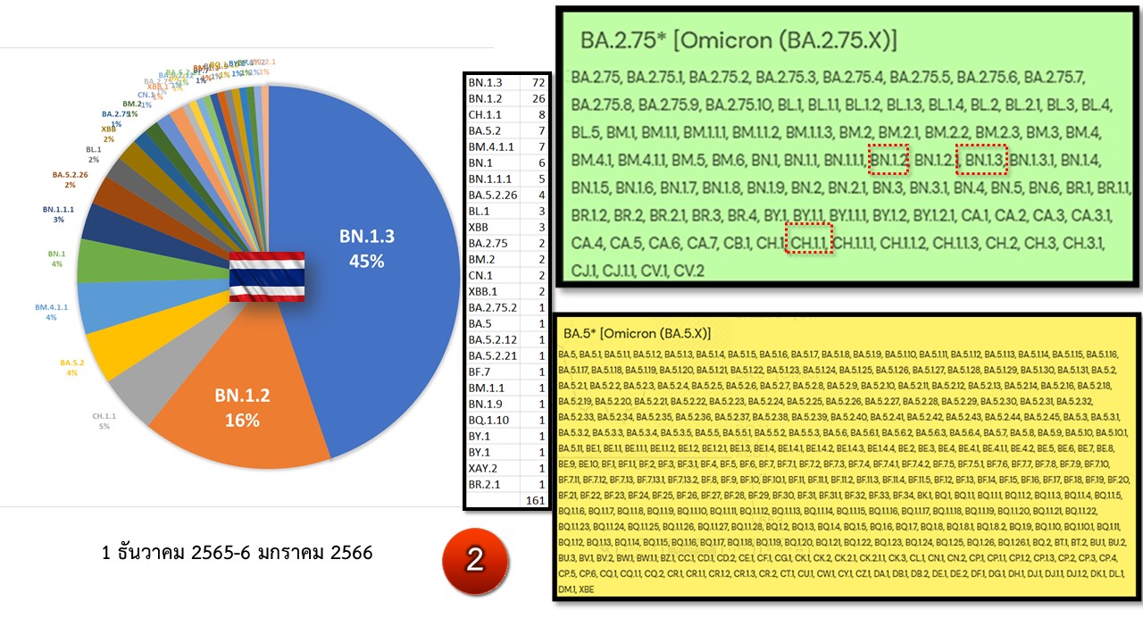 จากการวิเคราะห์ข้อมูลรหัสพันธุกรรมโควิดทั้งจีโนมที่หน่วยงานไทยนำโดยกรมวิทยาศาสตร์การแพทย์ฯและภาคี ที่ได้อัปโหลดไว้บนฐานข้อมูลโควิดโลก “GISAID” ใน 1 เดือนที่ผ่านมา (1ธันวาคม 2565-6 มกราคม 2566) จำนวน 161 ตัวอย่าง พบว่าเป็นโอไมครอนสายพันธุ์ย่อย BN.1.3 ซึ่งมีส่วนแบ่งการระบาดในไทยเพิ่มขึ้นถึง 45% ติดตามด้วย BN.1.2 ประมาณ 16% ส่วนอันดับที่ 3 ห่างจากอันดับหนึ่งและสองค่อนข้างมากคือ โอไมครอน CH.1.1 มีส่วนแบ่งการระบาดในประเทศประมาณ 5%