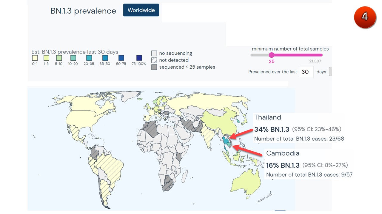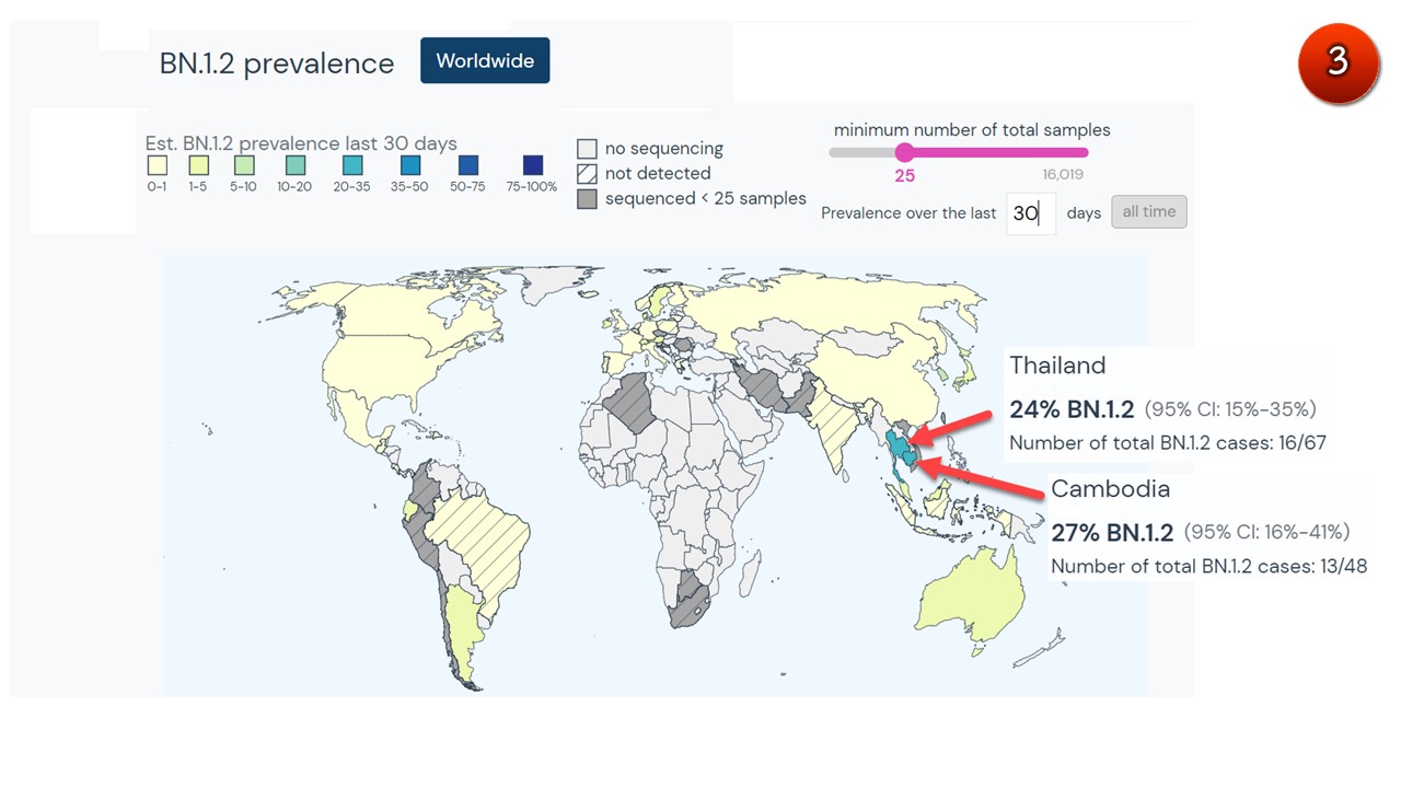 โอไมครอน BN.1.2 เดิมพบระบาดในญี่ปุ่น 18.0% เดนมาร์ก 12.0% ออสเตรเลีย 12.0% สหรัฐอเมริกา 9.0% เกาหลีใต้ 9.0% แต่ปัจจุบันพบระบาดในกัมพูชามากที่สุดในโลกถึง 2ึ7% รองลงมาคือไทย 24%