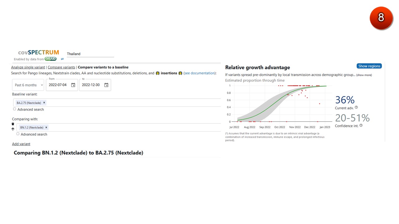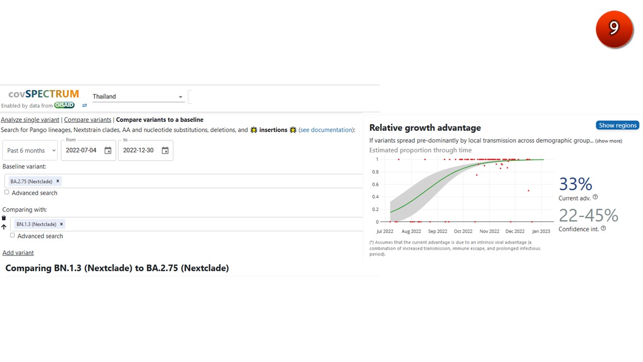 ในขณะที่ BN.1.2 และ BN.1.3 มีความได้เปรียบในการเติบโต-แพร่ระบาด (relative growth advantage) เหนือกว่า BA.2.75 ไม่มากนักคือประมาณ 36% และ 33% ตามลำดับ