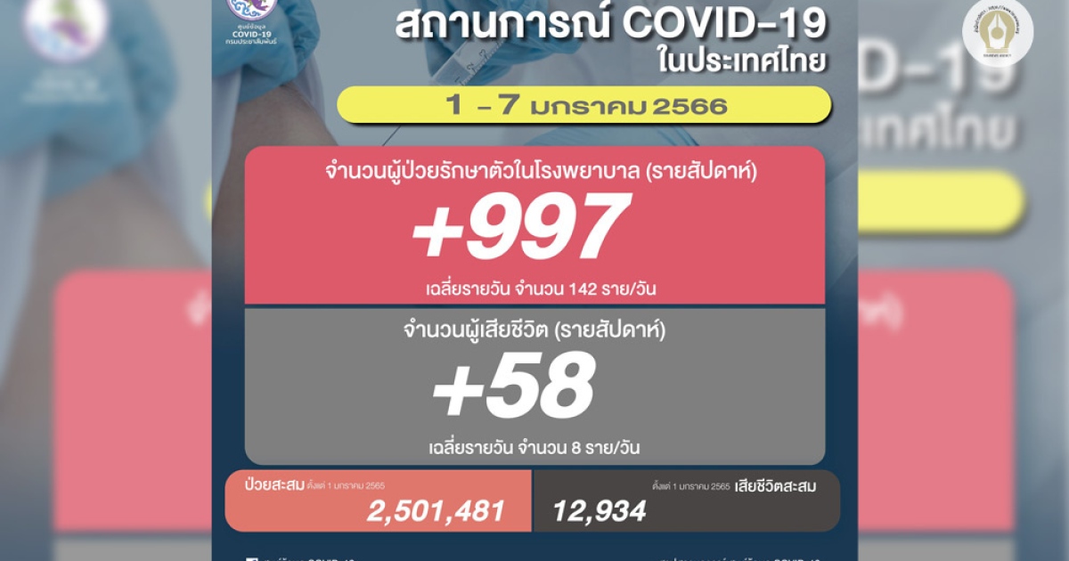 สถานการณ์โควิดไทย สัปดาห์ล่าสุด 1 - 7 ม.ค. 2566 ติดเชื้อเข้ารักษาใน รพ.ใหม่ 997 ราย เฉลี่ย 142/วัน เสียชีวิต 58 ราย เฉลี่ย 8/วัน อาการหนัก 382 ราย