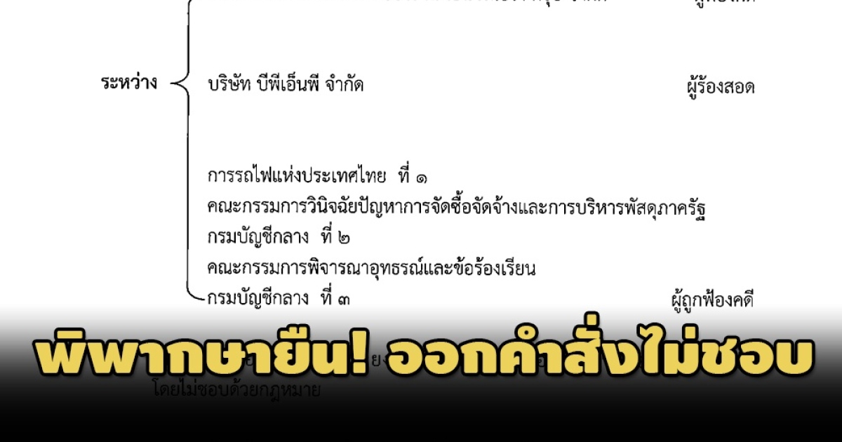 รายงานข่าวแจ้งว่า สำหรับคดีนี้ บริษัท ไชน่า เรลเวย์ นัมเบอร์เทน เอนจิเนียริ่ง กรุ๊ป จำกัด (ผู้ฟ้องคดี) ฟ้องว่า การรถไฟแห่งประเทศไทย (รฟท.) กับพวกรวม 3 คน (ผู้ถูกฟ้องคดี) กระทำการไม่ชอบด้วยกฎหมาย กรณีคณะกรรมการพิจารณาอุทธรณ์และข้อร้องเรียน กรมบัญชีกลาง (ผู้ถูกฟ้องคดีที่ 3) มีคำวินิจฉัยอุทธรณ์ ในประเด็นเกี่ยวกับคุณสมบัติและหนังสือรับรองผลงานของบริษัท บีพีเอ็นพี จำกัด (ผู้ร้องสอด) ตามหนังสือด่วนที่สุด ที่ กค (กอร) 0405.5/52945 ลงวันที่ 21 ต.ค.2563 ว่า