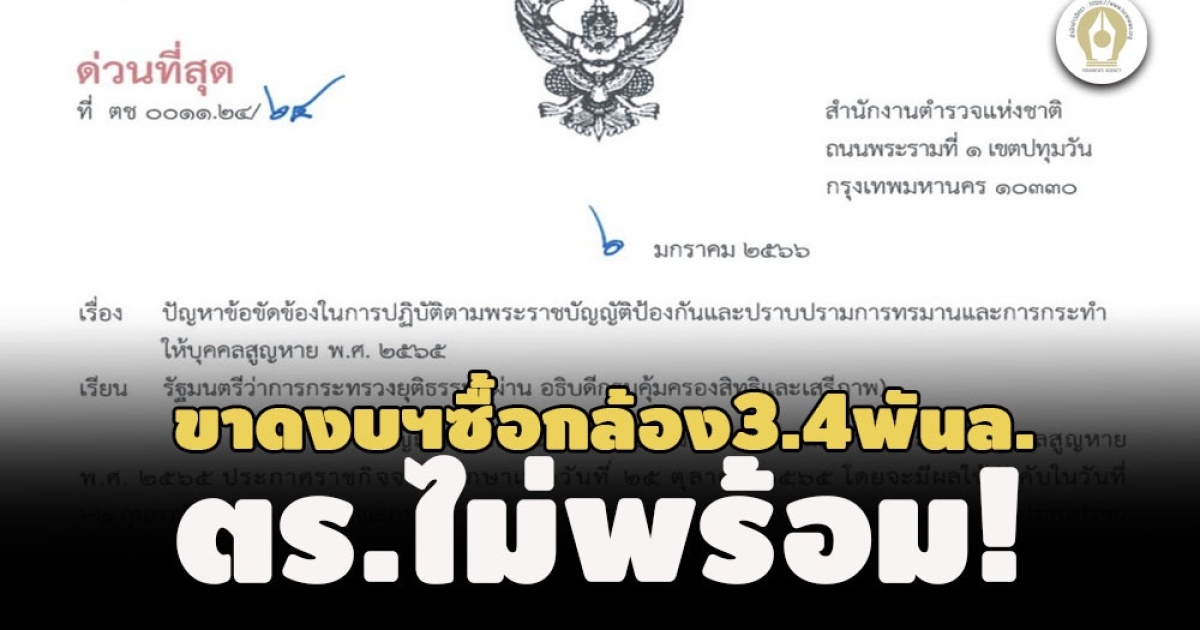 พ.ต.อ.ดำรงศักดิ์ กิตติประภัสร์ ผบ.ตร ทำหนังสือด่วนที่สุด ถึง รมว.ยุติธรรม ขอขยายเวลาบังคับใช้กม.หมวด 3 พ.ร.บ.ซ้อมทรมานฯ ยกเหตุติดขัด 3 ด้าน ความไม่พร้อมงบประมาณขาดเงินซื้อกล้อง-วางระบบ 3.4 พันล. จนท.ขาดทักษะ-มีความคลุมเครือในบทบัญญัติ เร่งดำเนินการไปอาจเกิดผลร้ายต่อสังคมแทน