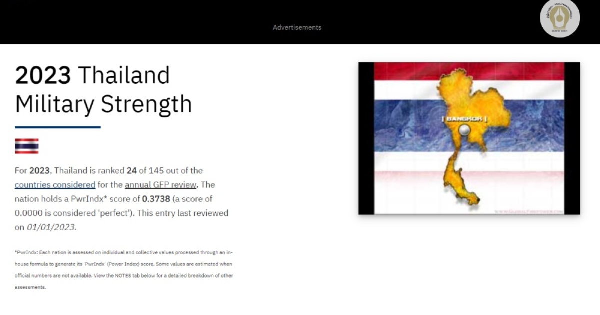 สำนักข่าวอิศรา (www.isranews.org) รายงานข่าวว่าเว็บไซต์ Global Fire Power ซึ่งเป็นเว็บไซต์จัดแสนยานุภาพทางทหารของประเทศต่างๆบนโลก พบว่าได้มีการจัดอันดับกองทัพไทยให้อยู่ในอันดับที่ 24 ของโลก จากประเทศทั้งหมด 145 ประเทศในปี 2566 ซึ่งถือเป็นอันดับที่สูงขึ้น โดยสูงกว่าประเทศเยอรมนีที่อยู่ในอันดับที่ 25 และอยู่ใต้ประเทศไต้หวันที่อยู่ในอันดับที่ 23