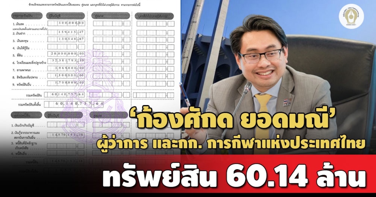 ป.ป.ช. เปิดบัญชีทรัพย์สิน 'นายก้องศักด ยอดมณี' กรณีเข้ารับตำแหน่งผู้ว่าการ และกรรมการ การกีฬาแห่งประเทศไทยสมัยที่ 2 มีทรัพย์สินรวมกว่า 60 ล้าน ที่ดิน 2 แปลงในจตุจักร- 3 ห้องชุดที่ กทม. รายได้ 3.4 ล้านต่อปี