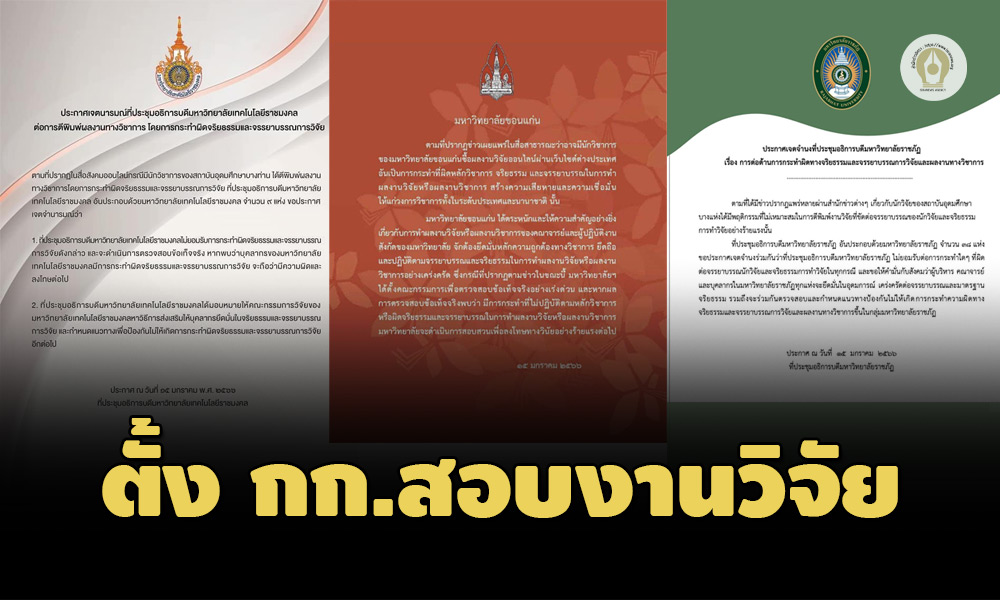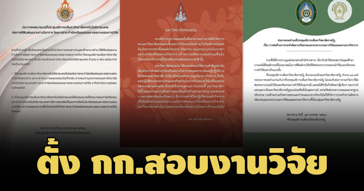 อีก 3 มหาวิทยาลัย 'มข.-ราชภัฎ-ราชมงคล' แถลงจุดยืน ตั้งกรรมการสอบงานวิจัย หลังมีกระแสอาจารย์ซื้อ-แปะชื่อ ลั่นหากพบ ลงโทษทางวินัยร้ายแรง จ่อออกแนวทางเพื่อป้องกัน
