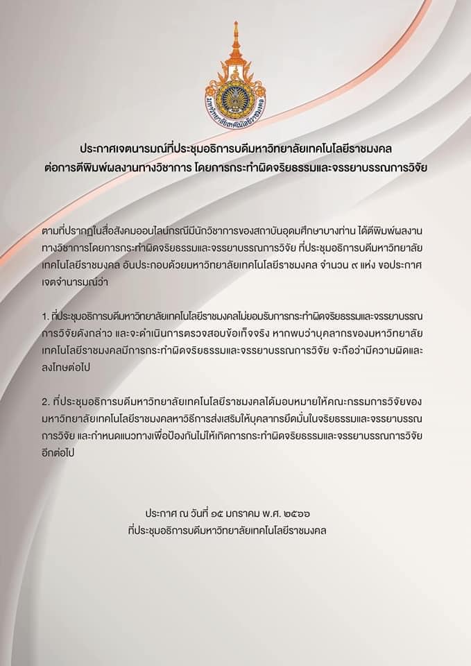 ตามที่ปรากฎในสื่อสังคมออนไลน์กรณีมีนักวิชาการของสถาบันอุดมศึกษาบางท่าน ได้ตีพิมพ์พลงานทางวิชาการโดยการกระทำผิดจริยธรรมและจรรยาบรรณการวิจัย ที่ประชุมอธิการบดีมหาวิทยาลัยเทคโนโลยีราชมงคล อันประกอบด้วยมหาวิทยาลัยเทคนโลยีราชมงคล จำนวน 9 แห่ง ขอประกาศเจตจำนารมณ์ว่า