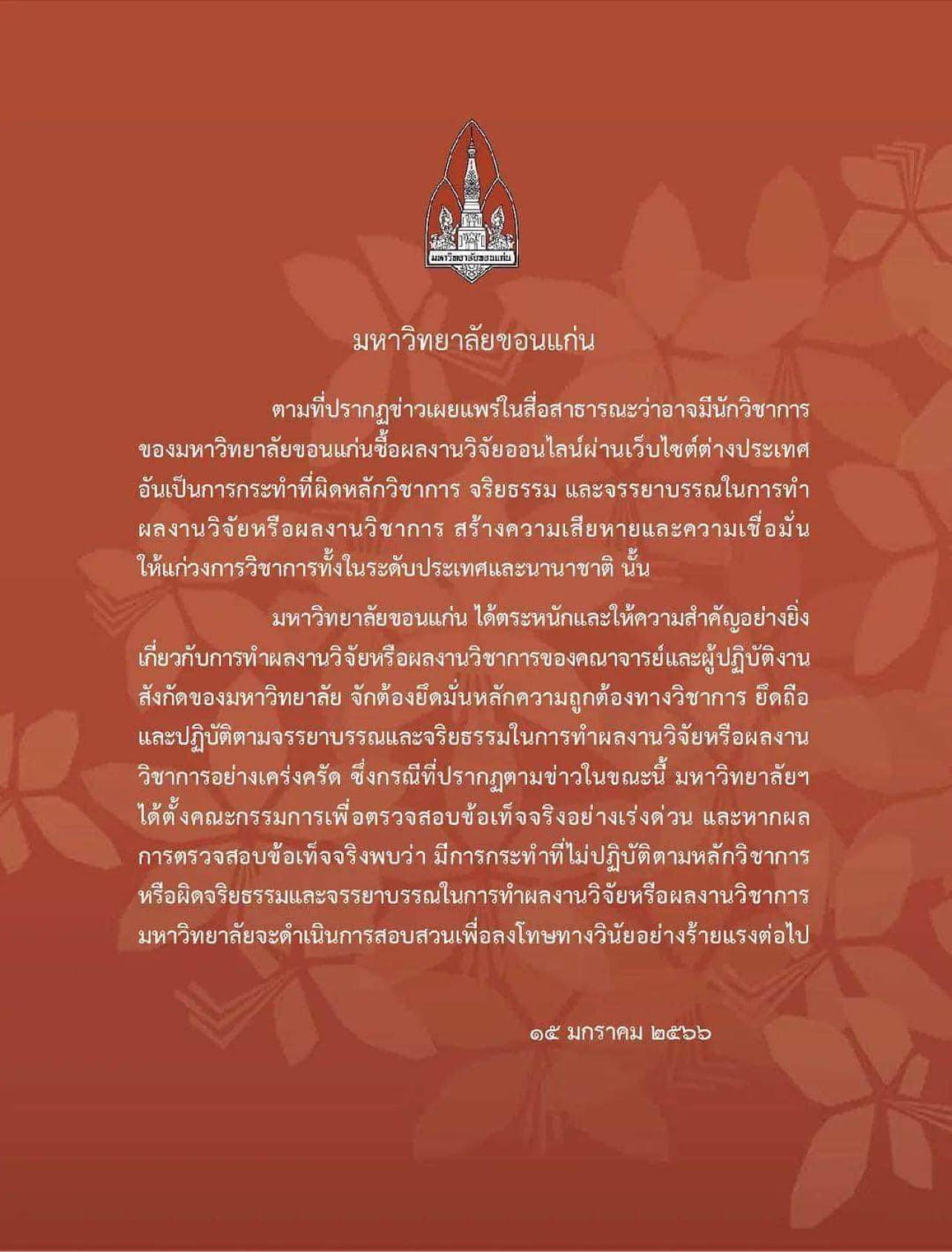 ล่าสุด มหาวิทยาลัยขอนแก่น ได้ออกประกาศผ่านเฟซบุ๊ก Khon Kaen University - มหาวิทยาลัยขอนแก่น ถึงกรณีการซื้องานวิจัยที่เกิดขึ้น ดังนี้