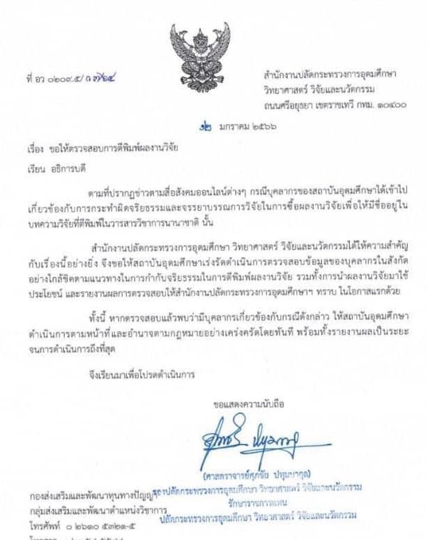 ผู้สื่อข่าวรายงานว่า ก่อนหน้านี้ ศ.ศุภชัย ปทุมนากุล. รองปลัดกระทรวงการอุดมศึกษาวิทยาศาสตร์ วิจัย และนวัตกรรม (อว.) ได้ส่งหนังสือเวียน อว 0209.5/ว 764 ถึงอธิบการบดีมหาวิทยาลัยต่างๆ เรื่อง ขอให้ตรวจสอบการตีพิมพ์ผลงานวิจัย มีความว่า