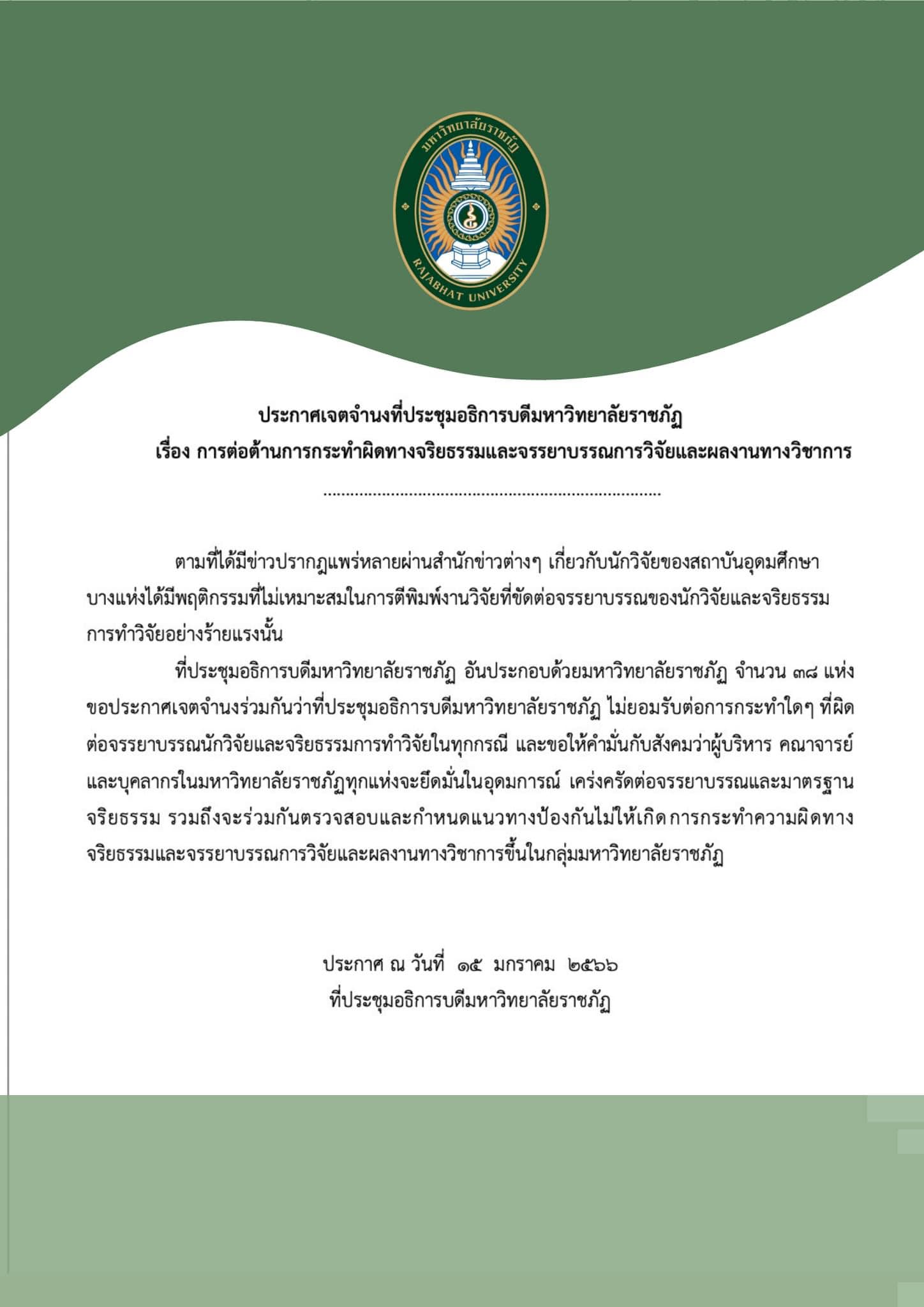 ที่ประชุมอธิการบดีมหาวิทยาลัยราชภัฏ อันประกอบด้วยมหาวิทยาลัยราชภัฏ จำนวน 38 แห่ง ขอประกาศเจตจำนงร่วมกันว่าที่ประชุมอธิการบดีมหาวิทยาลัยราชภัฏ ไม่ยอมรับต่อการกระทำใดๆ ที่ผิดต่อจรรยาบรรณนักวิจัยและจริยธรรมการทำวิจัยในทุกกรณี และขอให้คำมั่นกับสังคมว่าผู้บริหาร คณาจารย์และบุคลากรในมหาวิทยาลัยราชภัฏทุกแห่งจะยึดมั่นในอุดมการณ์ เคร่งครัดต่อจรรยาบรรณและมาตรฐานจริยธรรม รวมถึงจะร่วมกันตรวจสอบและกำหนดแนวทางป้องกันไม่ให้เกิดการกระทำความผิดทางจริยธรรมและจรรยาบรรณการวิจัยและผลงานทางวิชาการขึ้นในกลุ่มมหาวิทยาลัยราชภัฏ