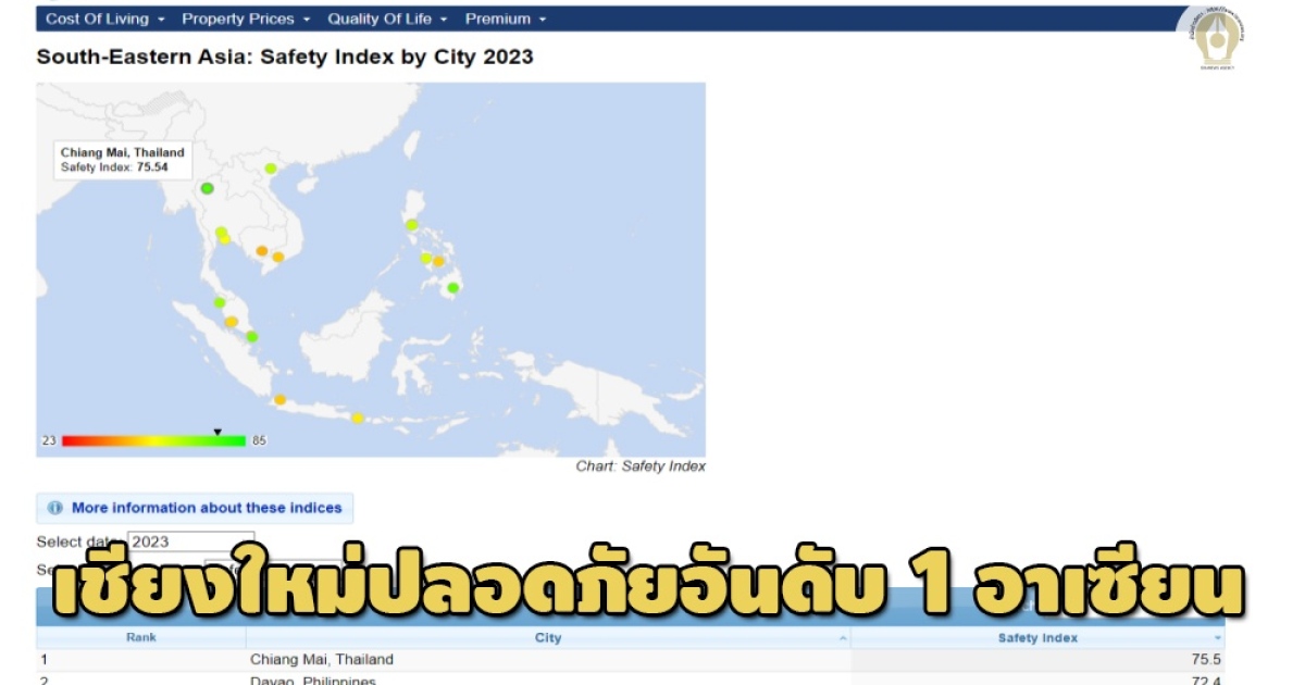 เว็บฐานข้อมูลนานาชาติจัดอันดับเชียงใหม่ปลอดภัยสุดอันดับหนึ่งในอาเซียน อันดับ 32 ของโลก ขณะกรุงเทพติดอันดับเจ็ดของอาเซียน อันดับ 170 ของโลก ส่วนพัทยาได้อันดับเก้าอาเซียน อันดับ 210 ของโลก ขณะกรุงอาบูดาบีครองแชมป์ปลอดภัยมากที่สุดในโลก